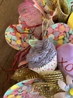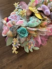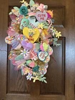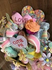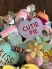Conversation Hearts Candy Cupcakes Valentines Day Deco Mesh Front Door Wreath. Large sweet door swag full of handmade goodies-cupcakes, marshmallow picks, embroidered leather hearts, decoupage heart cutouts, stuffed plush hearts, & wooden hearts. Variety of textures! Lux coordinating ribbons Felt florals and foam roses Approximate measurements 30x18x8 Pine swag base Not weather resistant Indoor or shaded outdoor décor recommended CREATED WITH LOVE!
