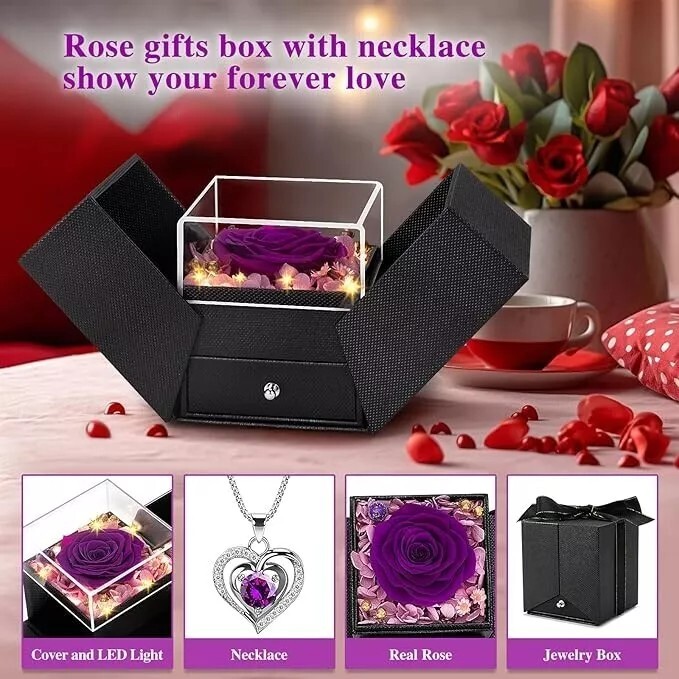 Meaningful Rose Gifts - The preserved roses symbolize eternal sincere love and the necklace represents guardians and means good blessings. Necklace and roses paired together, give them to your wife, girlfriend, mom, and grandma to express your endless love and blessings to them. Romantic Gift for Women - Our rose gifts are not only suitable for mothers and grandmoms on Mother's Day, but also for women on birthdays, Valentine's Day, Christmas, and anniversaries. Exquisite gift boxes and full blessed cards, bring surprises for them. Exquisite Home Decorations - Exquisite preserved flowers inside are great decorations, you can place them in the living room, bedroom, study, etc. of the house to add a warm atmosphere to your home. Easy To Care - Our preserved flowers are fresh, real roses, and the flowers are treated with a unique process to keep their original color and shape without wilting. You only need to put it in a dry place, with no watering or sunlight, it's very easy to maintain. 4 Color Options - We provide you with 4 different colors of preserved flowers, red, pink, blue, and purple, You can choose your favorite color for your loved one. No matter which one you choose, it can represent your most sincere love and blessings. Shipping We offer FREE shipping on all orders! We ship within Three business days of payment, usually sooner. We use a selection of shipping services such as UPS, FedEx, USPS etc. We only ship to the lower 48 states, no APO/FPO addresses or PO Boxes allowed. Local pickups and combined shipping options are not provided at this time. Return You can return a product for up to 30 days from the date you purchased it. Any product you return must be in the same condition you received it and in the original packaging. Please keep the receipt. Payment We accept payment by any of the following methods: PayPal Please pay as soon as possible after winning an auction, as that will allow us to post your item to you sooner! Feedback Customer satisfaction is very important to us. If you have any problem with your order, please contact us and we will do our best to make you satisfied. Contact Us If you have any queries, please contact us via ebay. We usually respond within 24 hours on weekdays. Please visit our eBay store to check out other items for sale! Thank you for shopping at our store. Disclaimer We are working with different suppliers in USA to deliver the item to your doorstep. If you have any issues regarding the item, Feel free to ask.