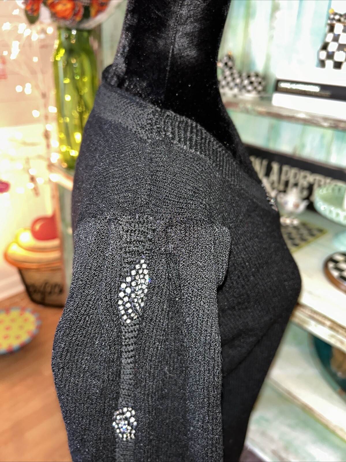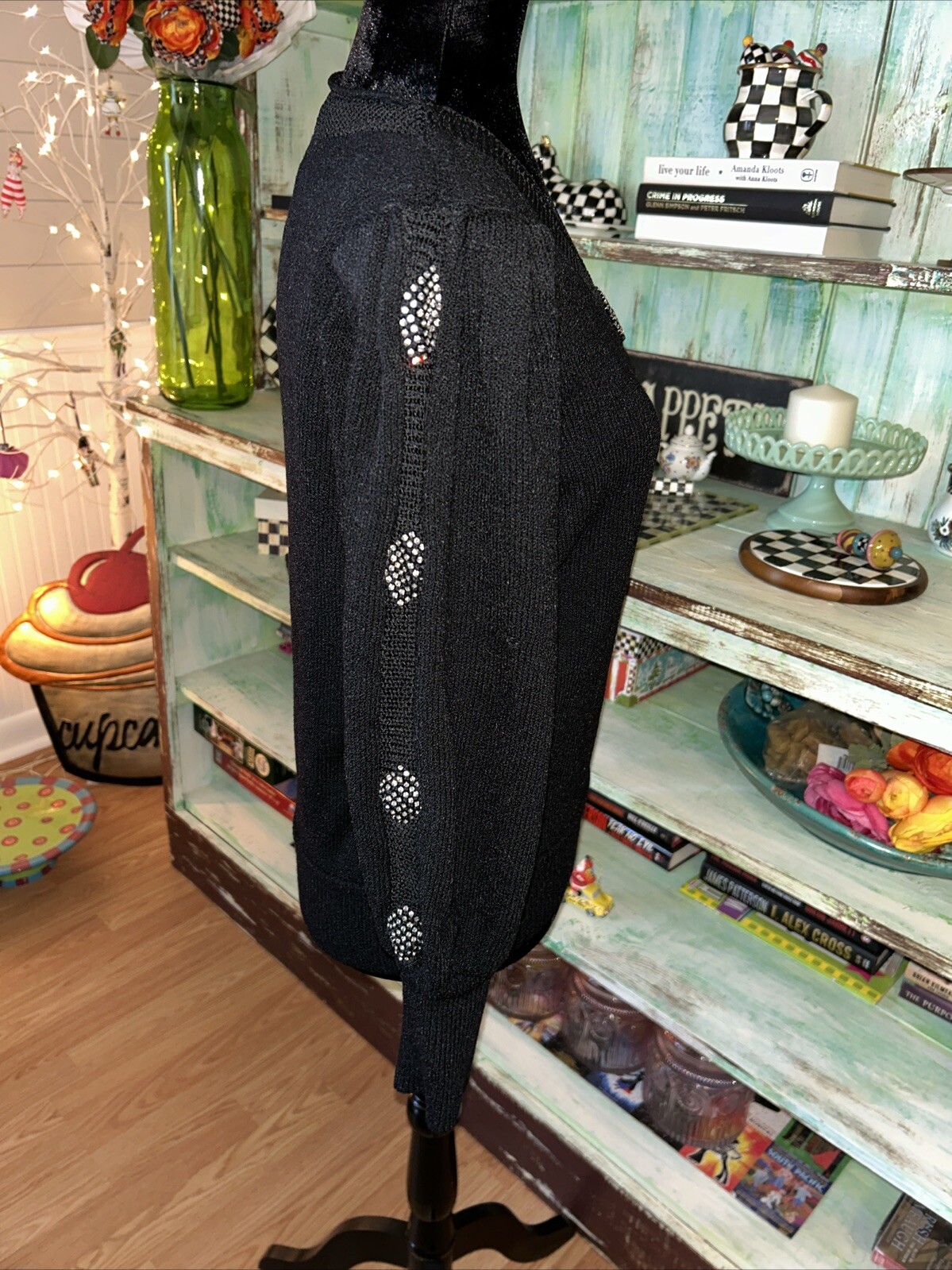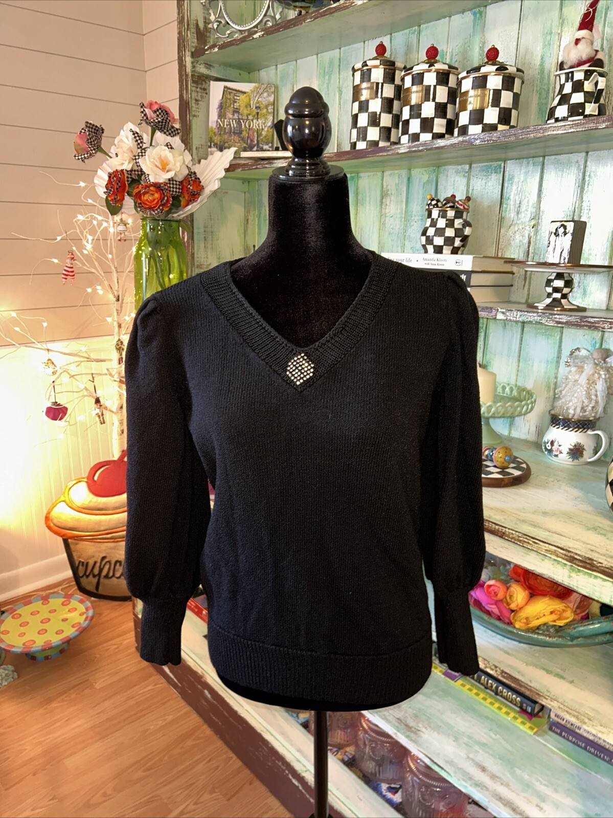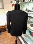 Elevate your wardrobe with this elegant Valentino Boutique Sweater. This vintage piece from the 80s-90s is made in Italy and features a classic fit with a V-neckline and long puff sleeves. The knit fabric is accented with black rhinestones and pleated details, making it perfect for formal occasions or parties. This sweater is in size 14, which runs small, so please refer to the measurements provided for a better fit. The solid black color and 80s-90s theme make it a stylish addition to your collection. It's suitable for fall, winter, and spring seasons, and the material tag is not available. Great condition knit a little loose in one place on back of neck. Can’t tell can be easily tacked.