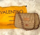 The Valentino By Mario Valentino Alice Tan Leather Quilted Chain Strap Shoulder Bag is a medium-sized handbag perfect for various occasions including travel, weddings, parties, formal events, work, and business. Made of tan camel brown leather with a quilted finish, this stylish bag features a foldover with turn lock closure and gold hardware accents. The shoulder strap is a chic combination of chain and leather in tan camel brown, with an adjustable length for versatility. The bag also includes inner pockets, authenticity card, and comes with a brand card and original dust bag for protection. Made in Italy, this bag exudes elegance and sophistication. A little stain inside and shows wear in the hardware but overall very good.