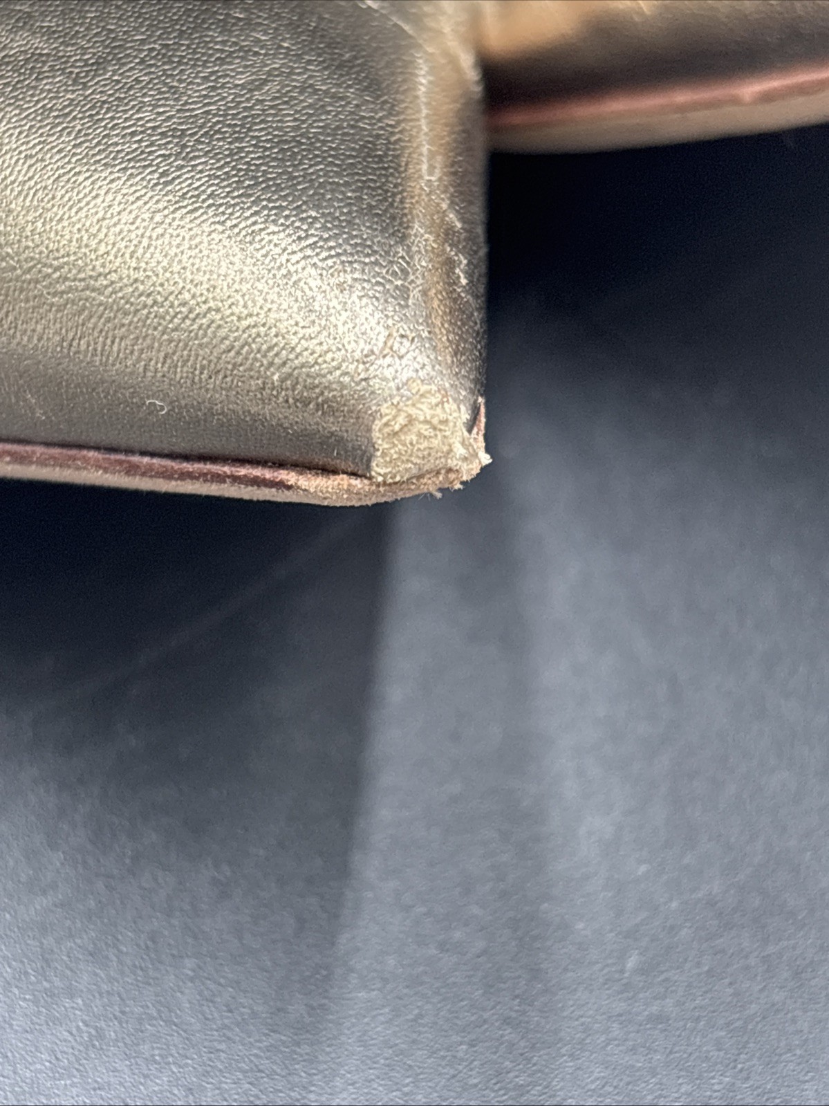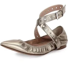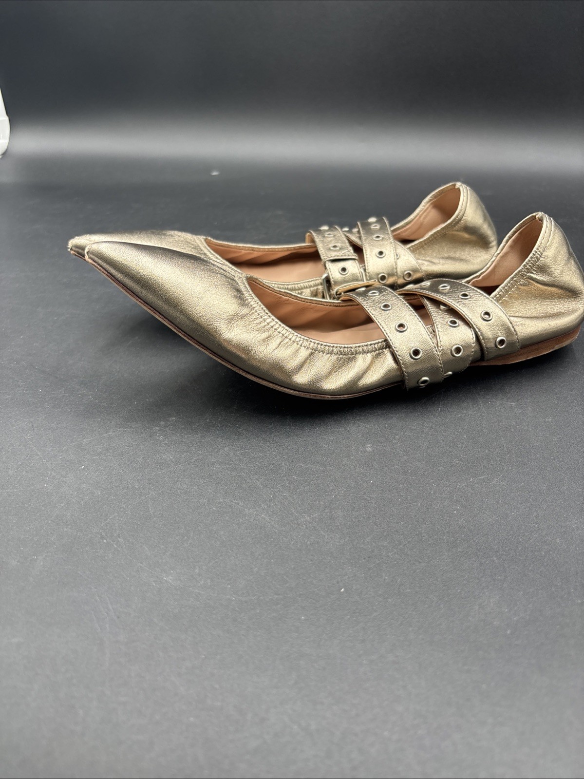 See photos for blemish. The Valentino Garavani Love Latch Metallic Wrap Ankle Flats in size 39 are a luxurious and stylish choice for women looking for a versatile shoe option. With a metallic gold color and ankle strap design, these flats are perfect for a variety of occasions from weddings to casual outings. Made from high-quality leather, they provide comfort and breathability, making them a practical yet fashionable choice for the modern woman. The adjustable strap and buckle detail add a touch of sophistication to these flats from the renowned Valentino Garavani product line.