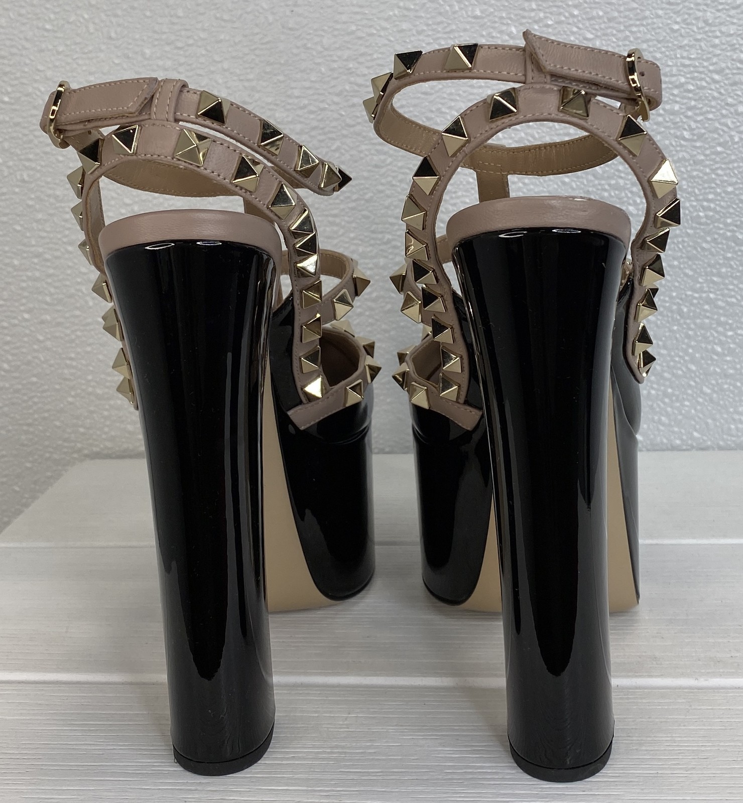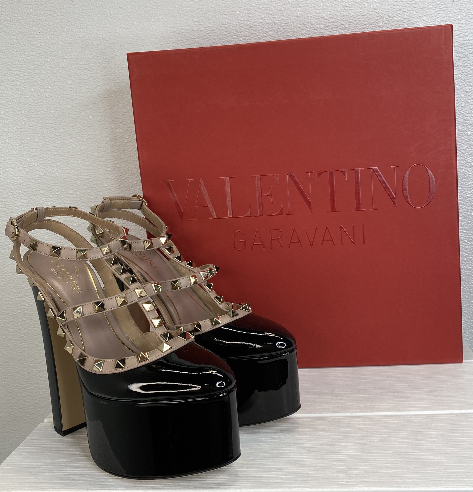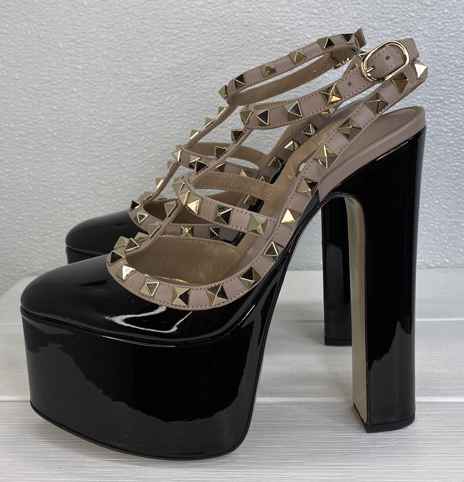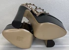 EU Shoe Size:35Department:WomenUpper Material:Patent LeatherStyle:PumpBrand:ValentinoToe Shape:Round ToeColor:BlackShoe Width:StandardCountry of Origin:ItalyOutsole Material:LeatherFeatures:Adjustable Strap, Dust Bag, StuddedType:HeelUS Shoe Size:5Lining Material:LeatherOccasion:Formal, Party/CocktailClosure:BuckleHeel Height:6.1"Heel Style:BlockPlatform Height:2.2"Insole Material:LeatherSeller Notes:“New with box. Minor scuffing of leather on heel of right shoe. See photos.”