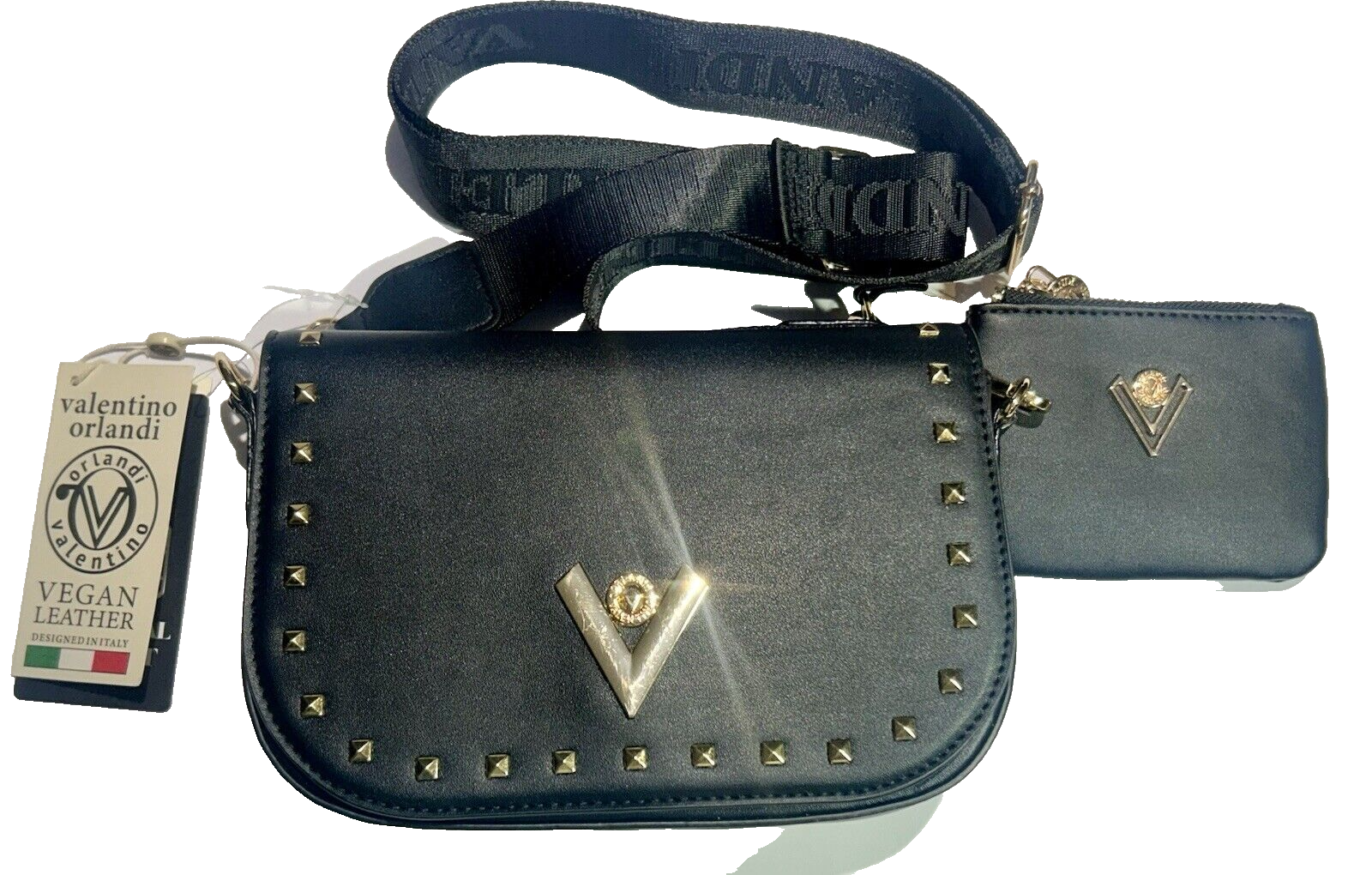 Elevate your accessory game with the Valentino Orlandi Style #V-2107S bag, a stunning combination of luxury and practicality. Crafted from supple black vegan leather with a matte finish, this medium-sized crossbody boasts a solid pattern accented with stylish gold studs, embodying the essence of Italian craftsmanship. The bag features a secure snap closure that opens to a matching black interior, complete with a detachable strap and a coin purse for organization. The adjustable black cross-body strap provides comfortable wear throughout the day, while the gold hardware adds a touch of elegance. Made in Italy, this piece is both timeless and modern, perfect for any wardrobe.