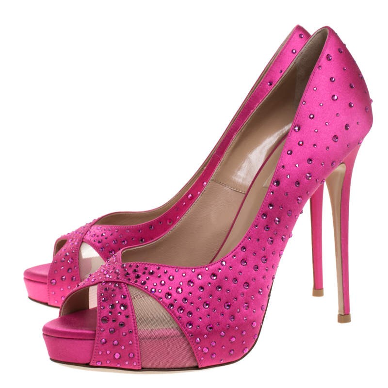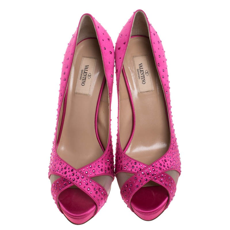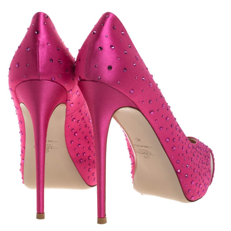 Our eBay Store About Us Contact Us Add to Favorite Sellers Valentino Pink Crystal Embellished Satin Peep Toe Platform Pumps Size 40 You can’t stop yourself from falling in love with these platform pumps from Valentino. Crafted from pink satin and embellished with crystals, they feature peep toes and 13 cm high heels supported by platforms. Product Details Brand Valentino Color Pink Includes The Luxury Closet Packaging Size 40 Outsole Length CM Outsole Width CM Certified by The Luxury Closet This item has gone through a detailed authentication process overseen by our experts. We offer a lifetime guarantee of authenticity on all our items. How We Check The in-house team of experts at The Luxury Closet is highly trained to verify the authenticity and the condition of the luxury products. They ensure that only 100% authentic items are put on sale.The evaluation process is unique with its own mix of assessment criteria and differs according to the category. Each item is evaluated based on the following combination of hallmarks, hardware, stitching, symmetry, material, craftsmanship, stamping, codes, hologram stickers, and packaging. Our authenticators also check if the items have been modified or amended (e.g., aftermarket diamonds, replaced batteries, repaired bags, etc.) International Buyers Import duties, taxes and charges are not included in the item price. These charges are the buyers responsibility. Please check with your country’s customs office to determine what these additional cost will be prior to buying.