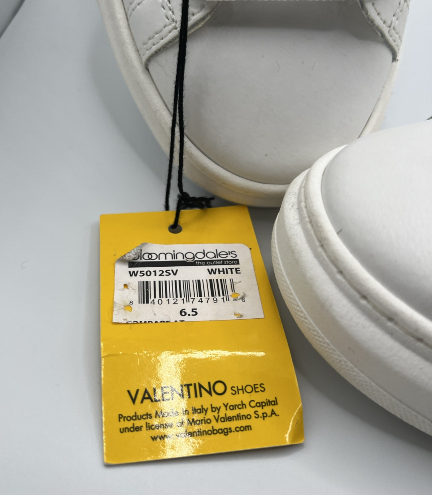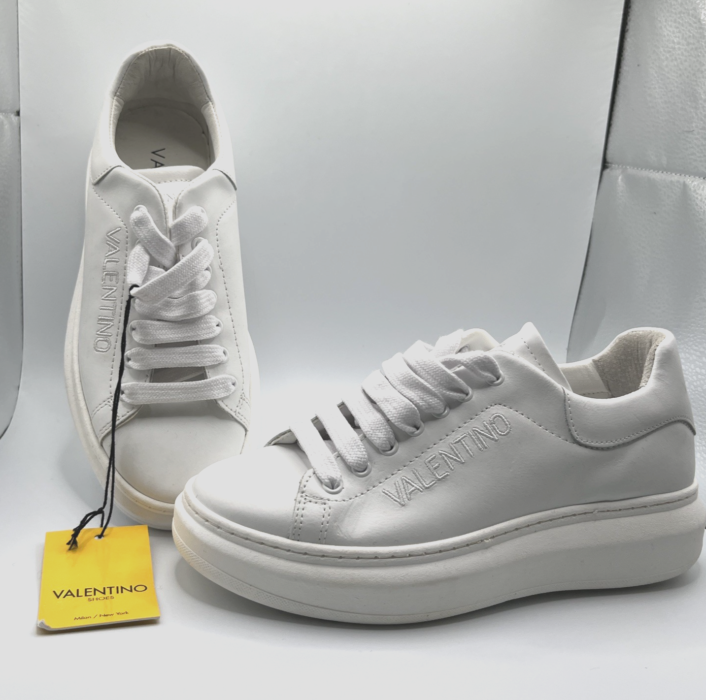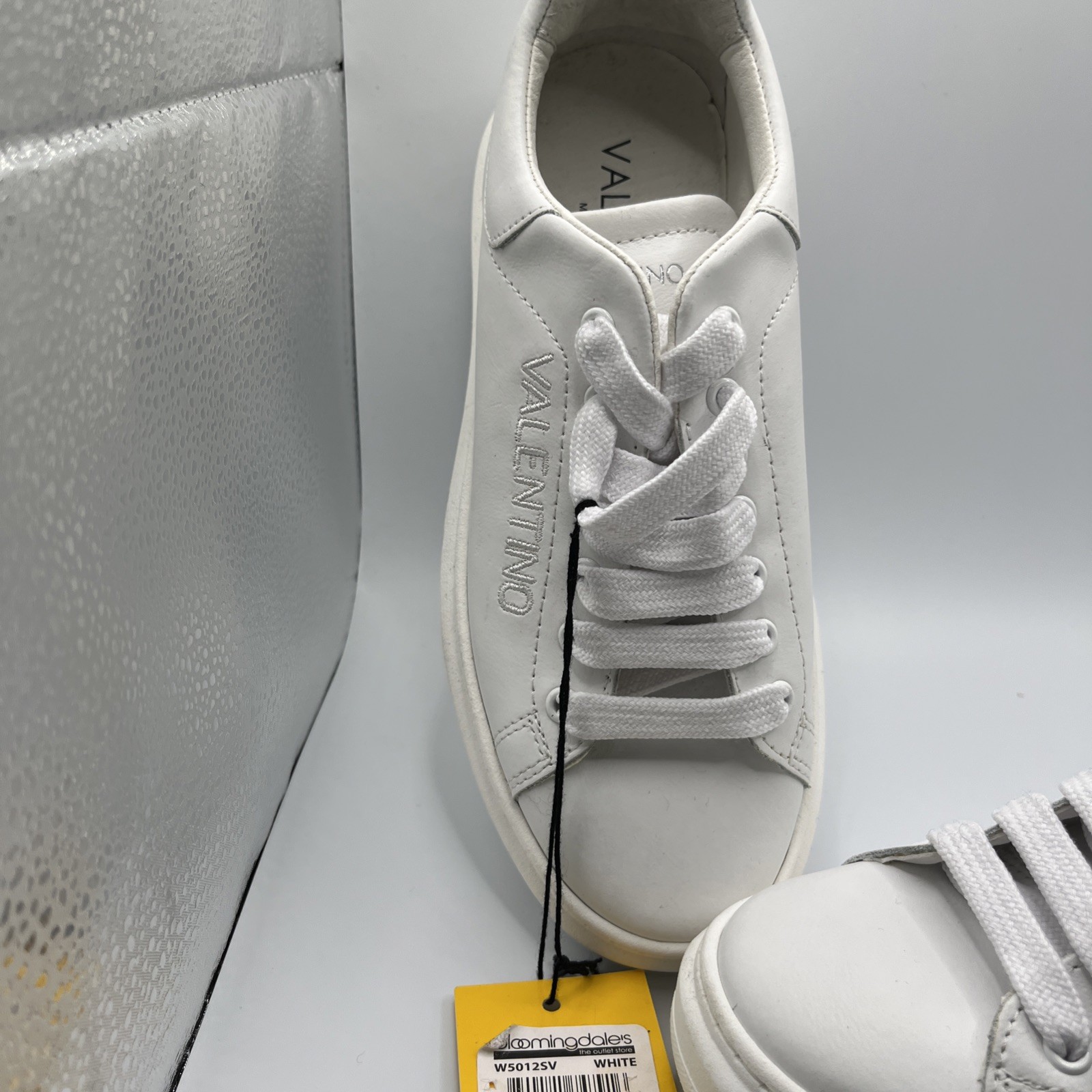 gtin13:840121747916Shoe Shaft Style:Low TopColor:WhiteVintage:NoShoe Width:StandardUPC:840121747916Fabric Type:leatherBrand:ValentinoType:AthleticTheme:DesignerClosure:TieDepartment:WomenPerformance/Activity:athleisureUK Shoe Size:4.5Accents:LogoCustomized:NoOccasion:Activewear, CasualEU Shoe Size:37Character:DesignerSeller Notes:“New - store display - tag attached - some minor creases and dust marks in leather”Country of Origin:ItalyUpper Material:LeatherStyle Code:W50125VModel:Valentino FresiaFeatures:Comfort, CushionedStyle:SneakerUS Shoe Size:6.5Signed:NoProduct Line:Valentino by Mario ValentinoPattern:Solid