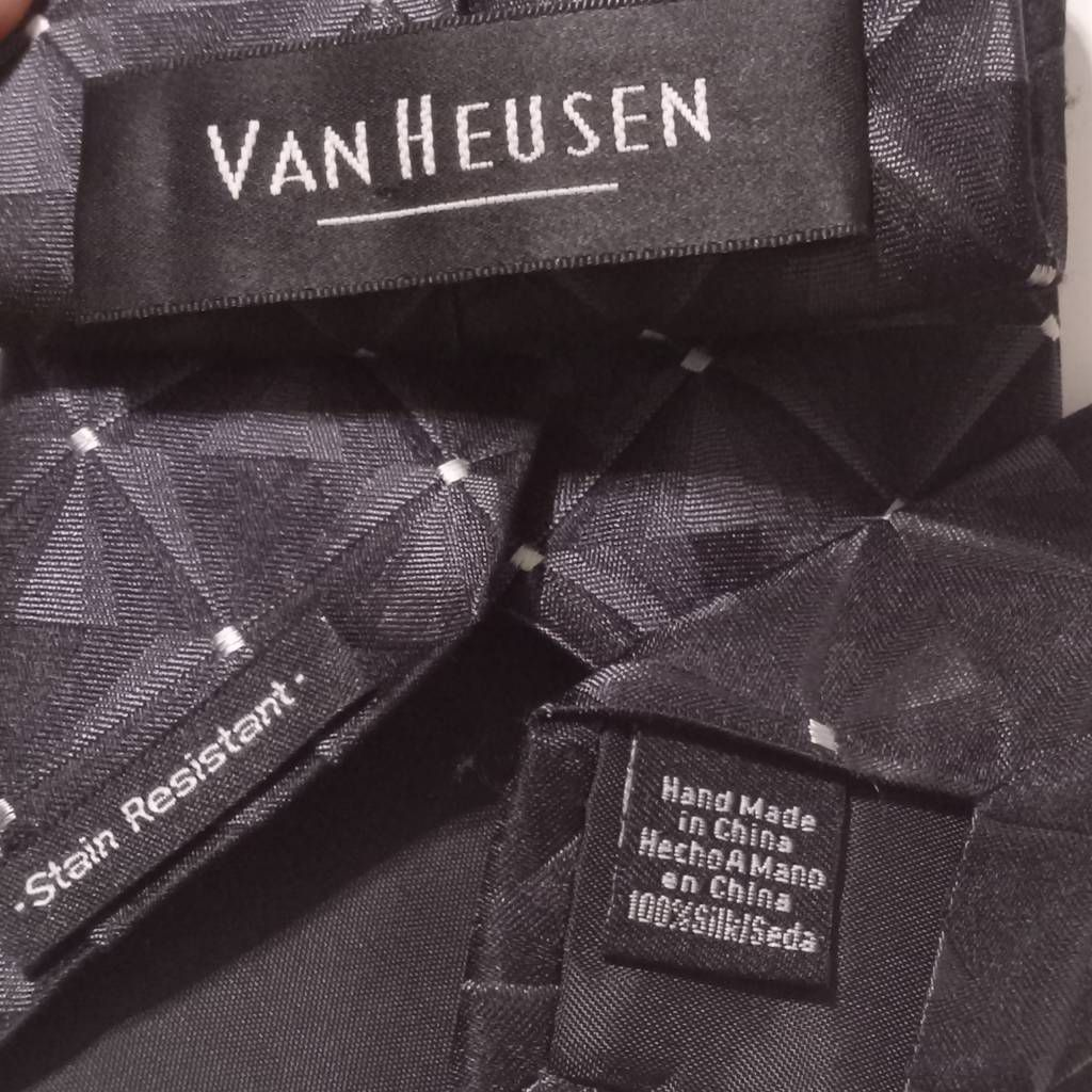 Van Heusen Mens Tie Necktie Black Geometric 100% Silk Tied Hand Made Classic 59" 59" length Brand: Van Heusen Style: Tie Necktie Color: Black Material: 100% Silk Attachment: Tied Length: Classic (57 In.-60 In.) Pattern: Geometric Sold as pictured. Thanks for looking! This listing was easily created using the SellHound Posting App! Thanks again for checking out our store.