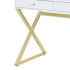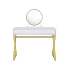Simple and elegant, this vanity desk with a mirror that can be removed out and can be used as an ordinary writing table. The 2 drawers and the spacious tabletop, can make your vanity set cleaner and tidy. Rests atop on metal cross design legs ensuring prolonged durability, this is a lovely place for your morning and nighttime routines.FeaturesA single piece of vanity desk onlyWide rectangular top2 Storage drawers with jewlery tray includedMetal frame with cross design legsRound removable mirrorCrystal like knob pullsFloor gliders prevents from scratching Free Shipping Over $49.99* Details Vanity Desk with Removable Mirror and Cross Metal Legs, White and Gold Product Description: Simple and elegant, this vanity desk with a mirror that can be removed out and can be used as an ordinary writing table. The 2 drawers and the spacious tabletop, can make your vanity set cleaner and tidy. Rests atop on metal cross design legs ensuring prolonged durability, this is a lovely place for your morning and nighttime routines. Features A single piece of vanity desk only Wide rectangular top 2 Storage drawers with jewlery tray included Metal frame with cross design legs Round removable mirror Crystal like knob pulls Floor gliders prevents from scratching
