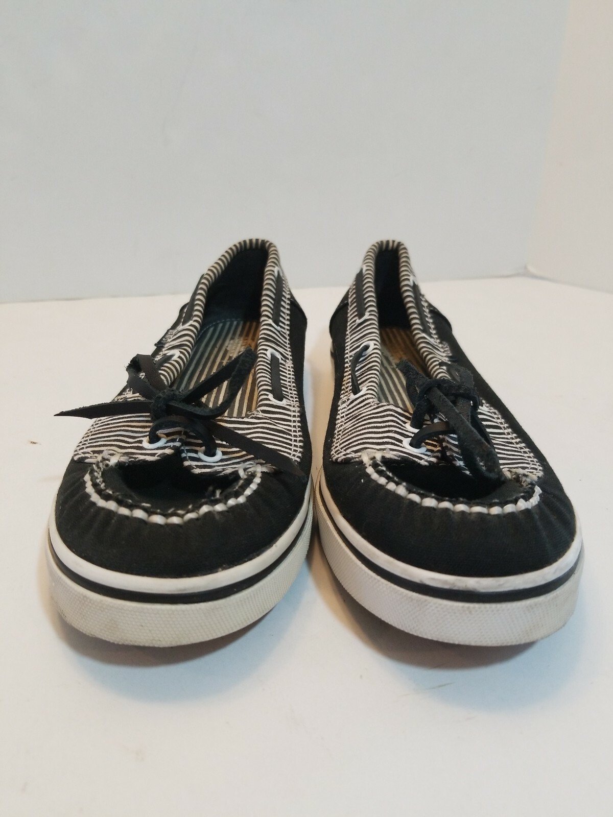 Vans Abby Boat Shoes Black/White Striped Slip On Sneakers Women's Size 7M Moc Toe Location: SB9