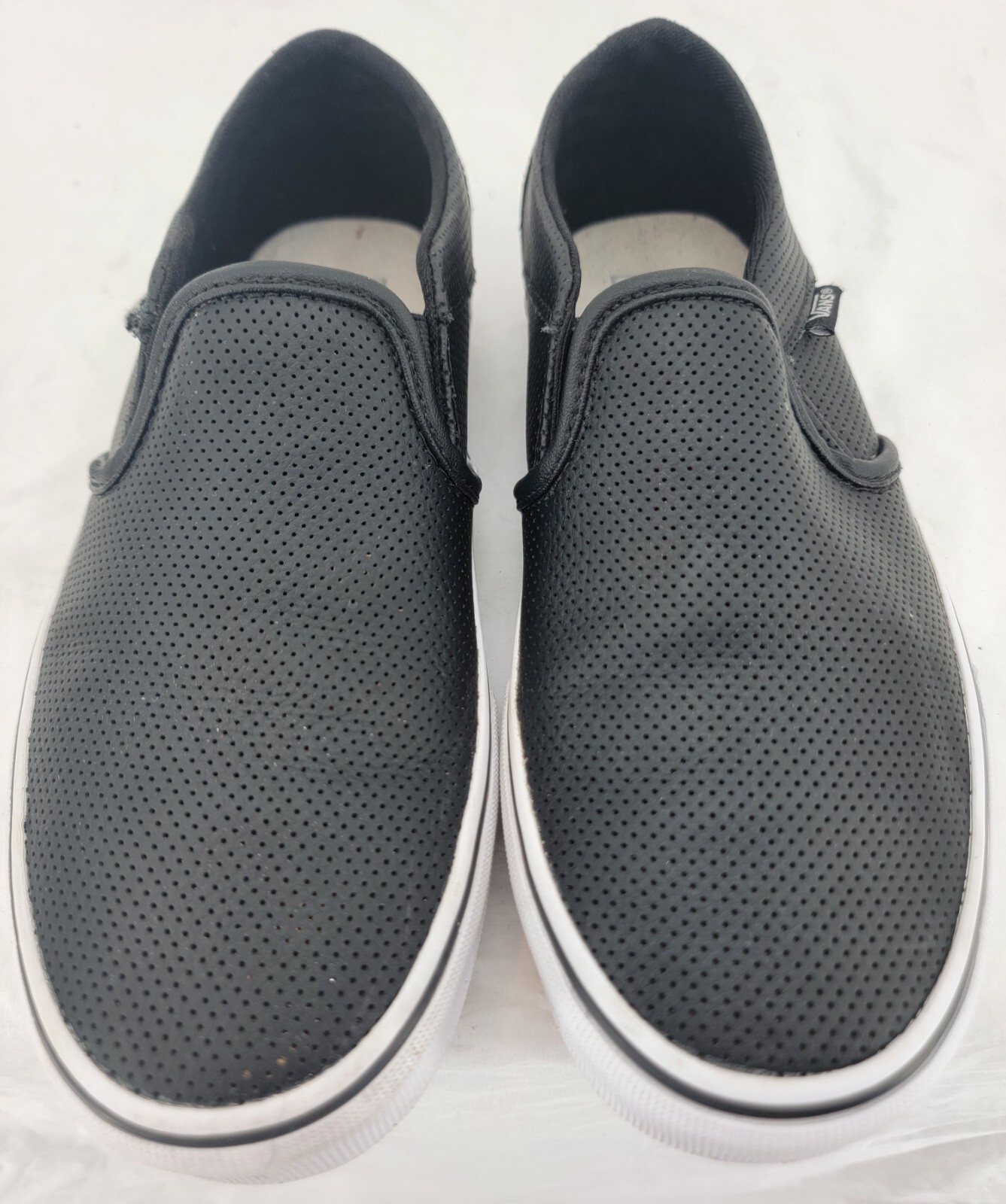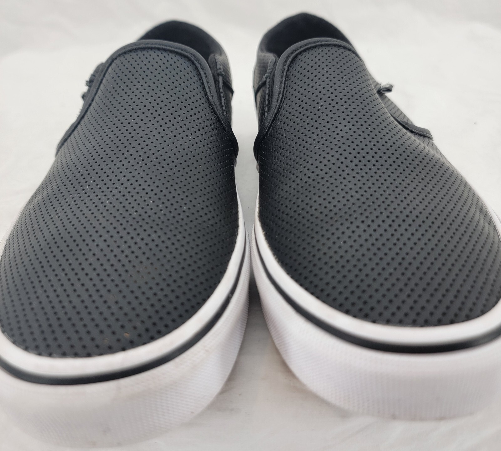 ALL MY ITEMS ARE GUARANTEED AUTHENTIC. ITEM : Vans 721356 Asher Black Leather Perforated Slip-On Loafer skate Shoes Women's 7 SIZE: Women's US 7 COLOR : Black CONDITION: Great! Light creasing and scuffing. Light wear on soles. See pictures! MEASUREMENTS : The bottom sole measures 10" in length from heel to toe, and 3.5" in width at the widest point. SHIPPING: Flat rate of $9.80 Please let me know if you have any questions. I strive for ALL 5 star ratings & positive feedback by providing my customers with satisfaction guaranteed service. Once you receive your item and you are satisfied, Positive Feedback will be highly appreciated. If you have any issues or feel the need to leave negative or neutral feedback, PLEASE contact me first and I will try to resolve your matter. Thank You!!! 2D19 TP1123