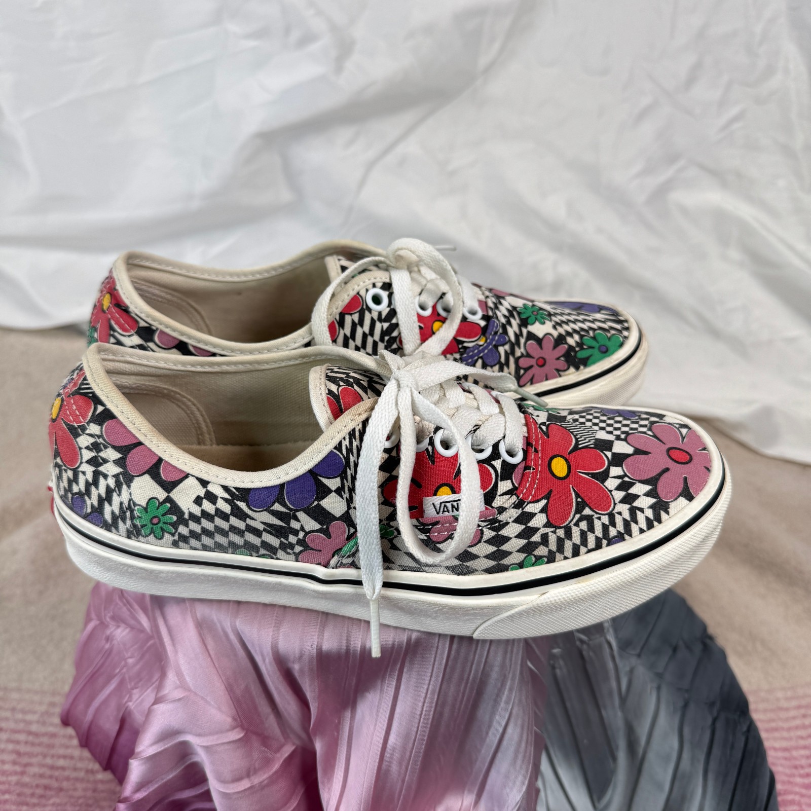 Original Vans Authentic low-tops in the Floral Checkerboard print. Size: Women 8 / Men 6.5 (EU 38.5) Canvas uppers, rubber waffle soles Color: Multi / Marshmallow Smoke-free storage; gently used with normal signs of wear. Ships fast and packed carefully.