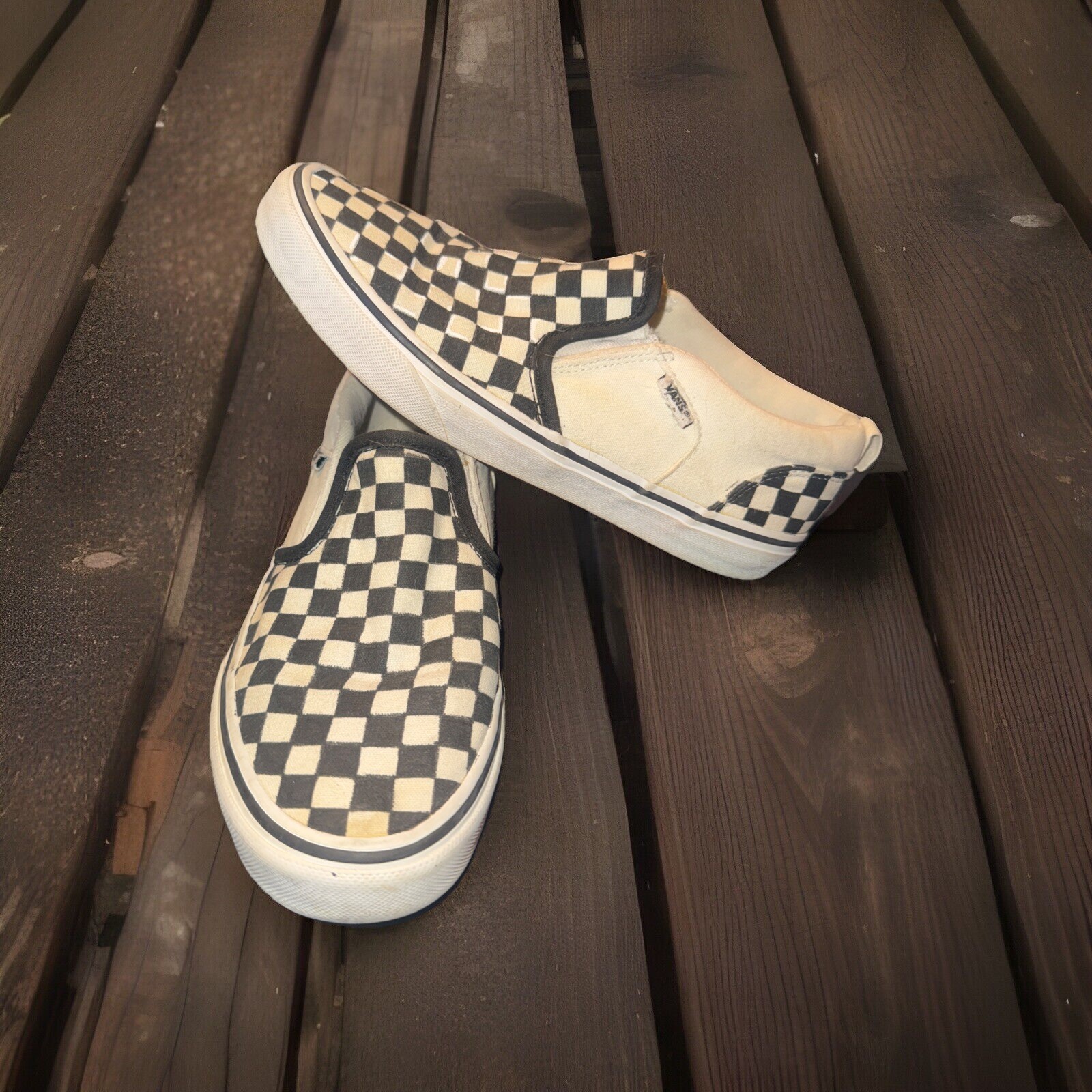 Add some colorful charm to your wardrobe with these Vans black and white checkered slip-on loafers. Perfect for women who want to add a touch of casual style to their outfit, these shoes come in a size 7 and are designed with a slip-on closure for easy wear. The upper material is made from high-quality fabric that is both durable and comfortable. These Vans loafers are perfect for anyone who loves fashionable yet comfortable footwear. The multicolor design adds a playful touch to your outfit, making them ideal for everyday wear. Whether you're running errands or meeting up with friends, these shoes are a must-have for any fashion-forward woman.