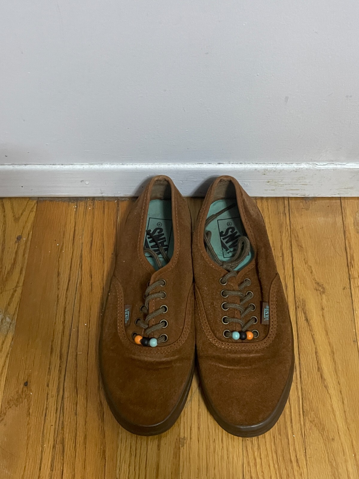 These Vans sneakers in brown are designed in a loafer style, suitable for both women and men in adult unisex sizes. They feature a lace fabric type and come in a US shoe size 6.5 for women and 5 for men. The model number is Vans TB6Q.