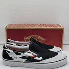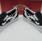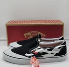 Step up your sneaker game with these Vans Classic Slip-On shoes. The black canvas upper material features a unique flame pattern and white accents that add a touch of style to any outfit. These low-top athletic shoes are perfect for school, cross training, or skateboarding. The slip-on closure ensures comfort and ease of wear, while the shoe shaft style and features, such as the Vans Classic Slip-On line, make them a great addition to any wardrobe. These unisex adult shoes are available in men's size 10 and women's size 11.5, and are brand new with tags. Don't miss out on these stylish and comfortable Vans sneakers!