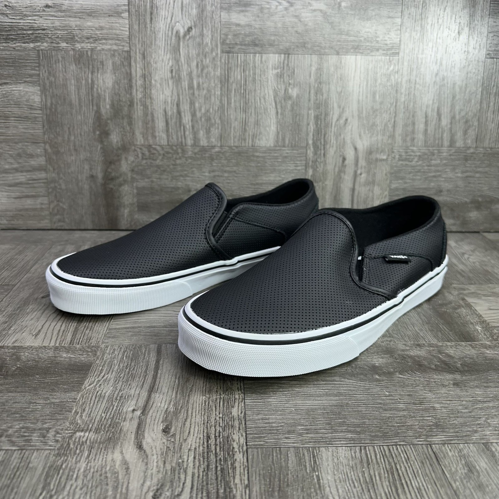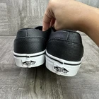 The Vans Classic Slip On Women's size 9.5 Leather Shoes are a stylish and comfortable option for casual wear. Featuring a slip-on design with a rubber outsole and leather upper, these sneakers offer both practicality and durability. The classic Vans logo accent adds a touch of nostalgia to the timeless black color, making them suitable for summer, fall, and spring seasons. Perfect for skateboarding or everyday use, these Vans shoes provide the perfect blend of style and comfort for women looking for a versatile athletic option.