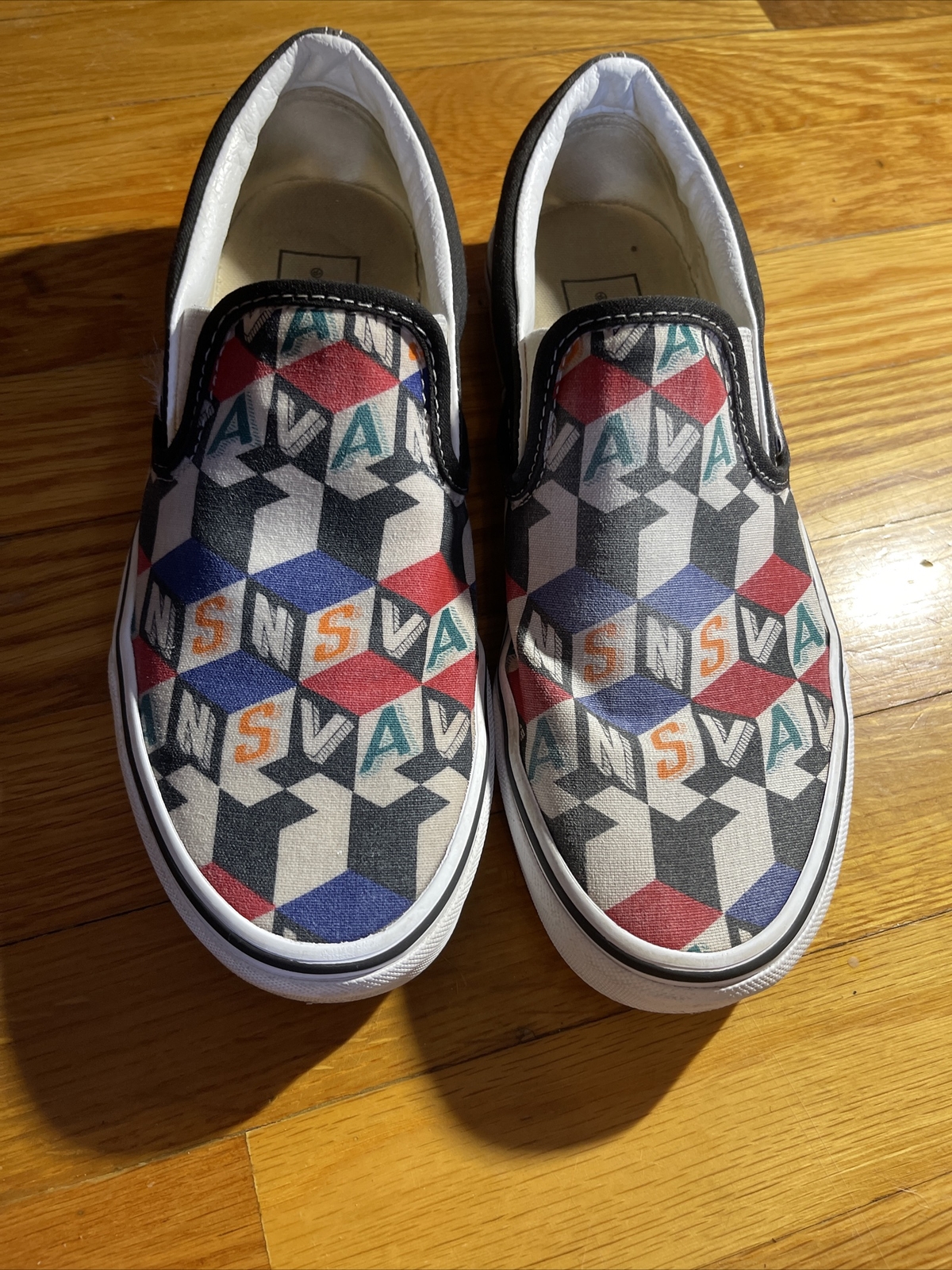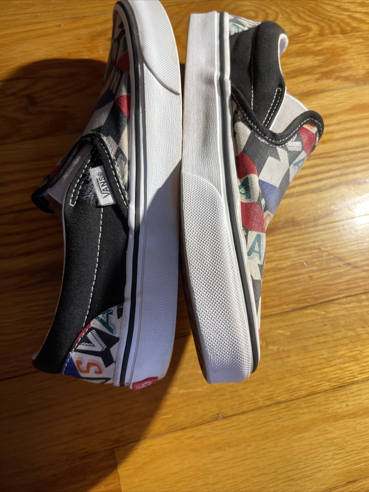 Vans is a pre-owned men's sneaker that is perfect for athletic activities. It is a popular brand known for its quality and style. Fit larger but still order isbits your size
