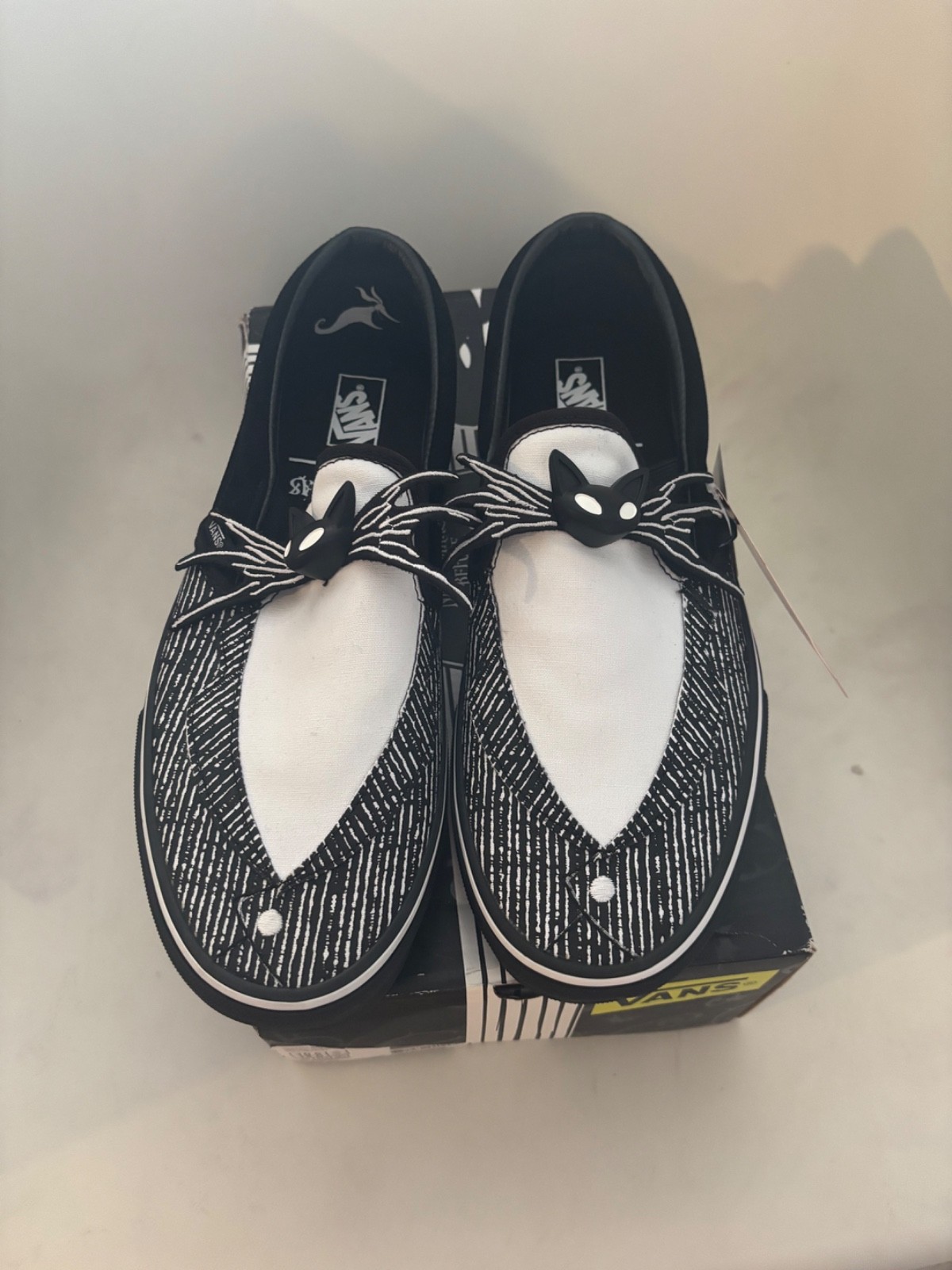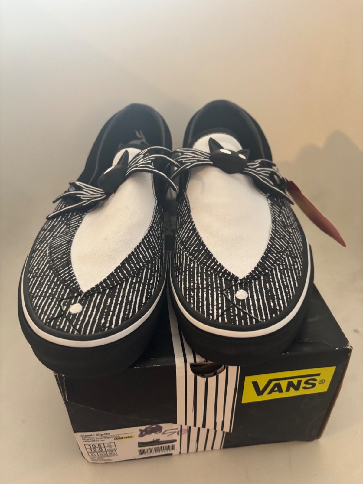 Vans x Disney Nightmare Before Christmas Slip-Ons — Jack Skellington edition. Size 10.5, brand new in box. Never worn. Model: VN0A4BV3TV4V — yeah, the real ones. Perfect for Halloween, Tim Burton fans, or anyone who lives on black coffee and sarcasm. I took a few photos. If you’re serious, I’ll send more. Ships fast with tracking — no flakes, no lowballs. Let’s make it happen.