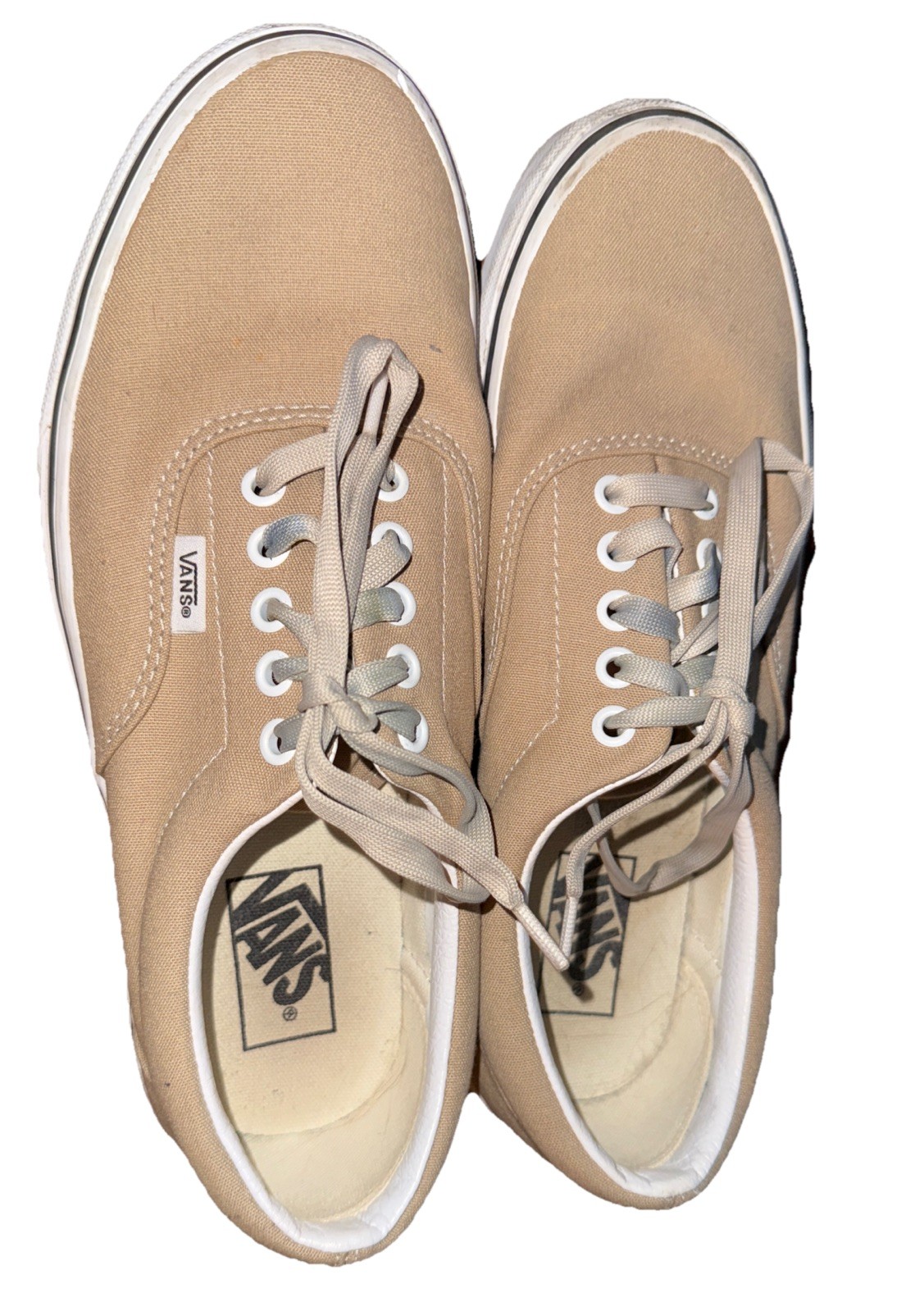 Outside of the shoe looks nearly new! A little dirty where the foot part goes (pictured). The Vans Era Skate Shoe in men’s size 8.5 or women’s size 10 is a stylish and versatile athletic shoe perfect for casual occasions. Featuring a low top design with a lace-up closure, this shoe is ideal for summer, fall, and spring seasons. The beige color and canvas lining add a touch of comfort and style, while the rubber outsole provides durability and support. With its iconic Vans Era model and standard shoe width, this sneaker is a classic choice for both males and females looking for a trendy and practical footwear option.