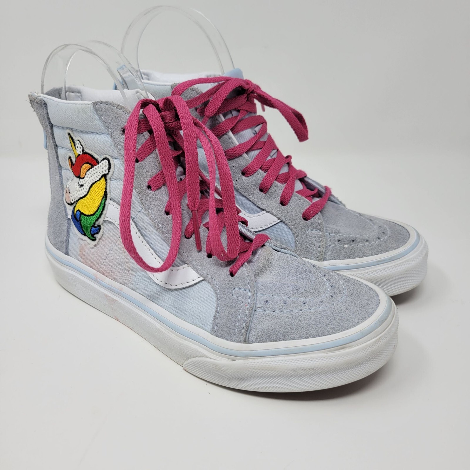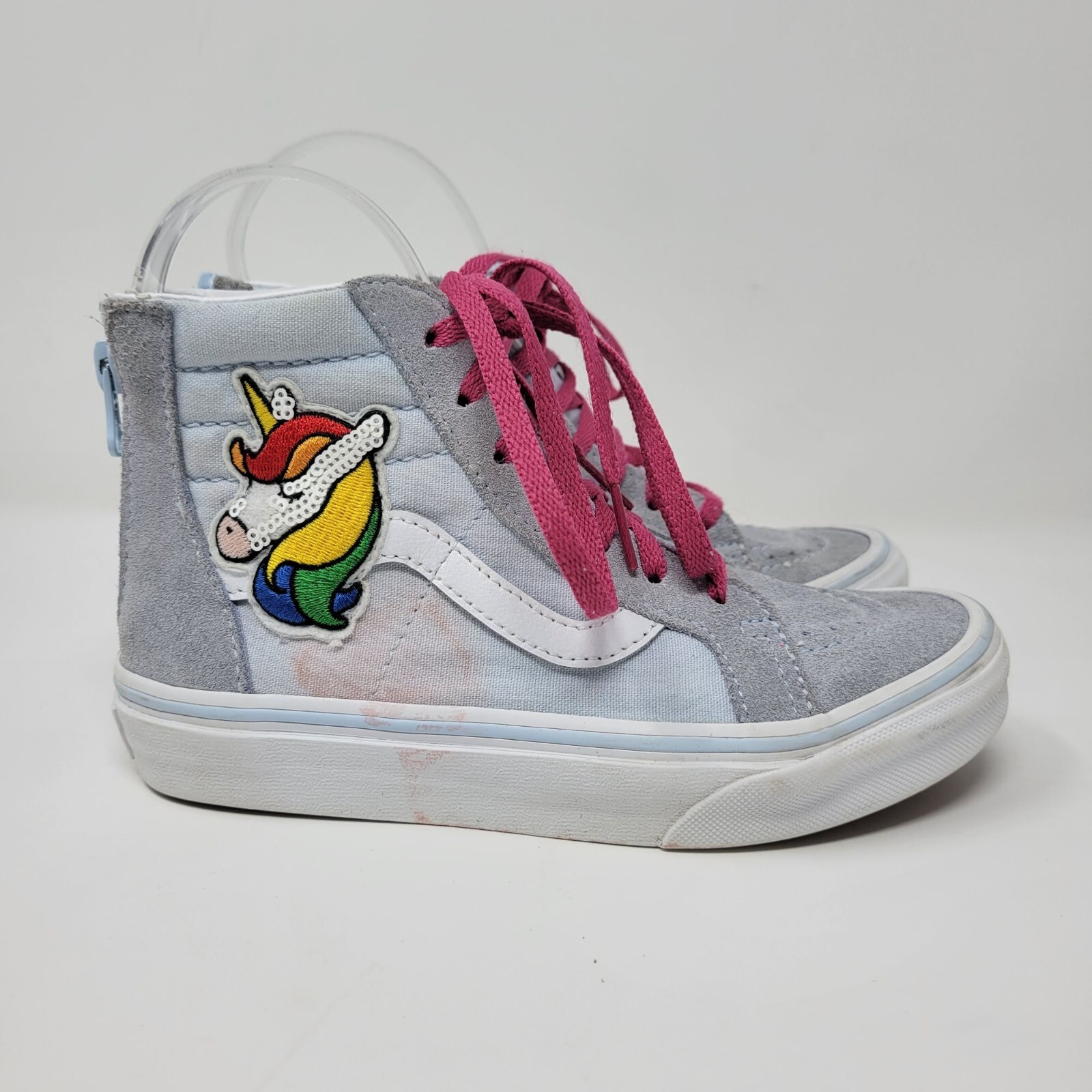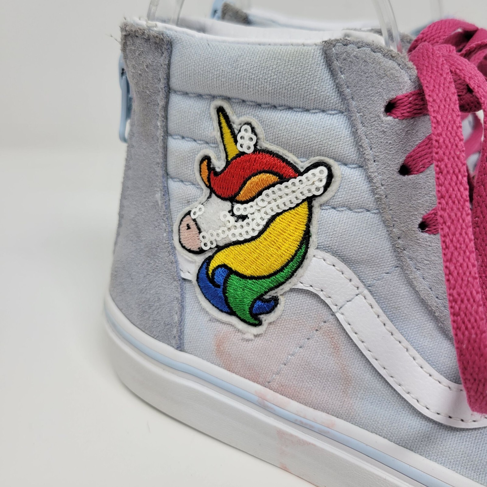 Classic high-top canvas suede shoes in a light blue unicorn design for girls, offering a stylish and fun look. These shoes are perfect for everyday wear, providing comfort and durability. • High-top design • Light blue color • Fun unicorn pattern • Comfortable for daily use • Durable canvas and suede material Features: • sneaker Size: 2 Good pre-owned condition, structurally good condition, there are stains and marking throughout the shoe and the unicorn is missing some sequins. please see all photos. Sold As picutred. Thanks for viewing!