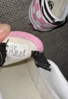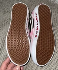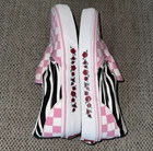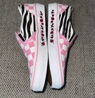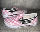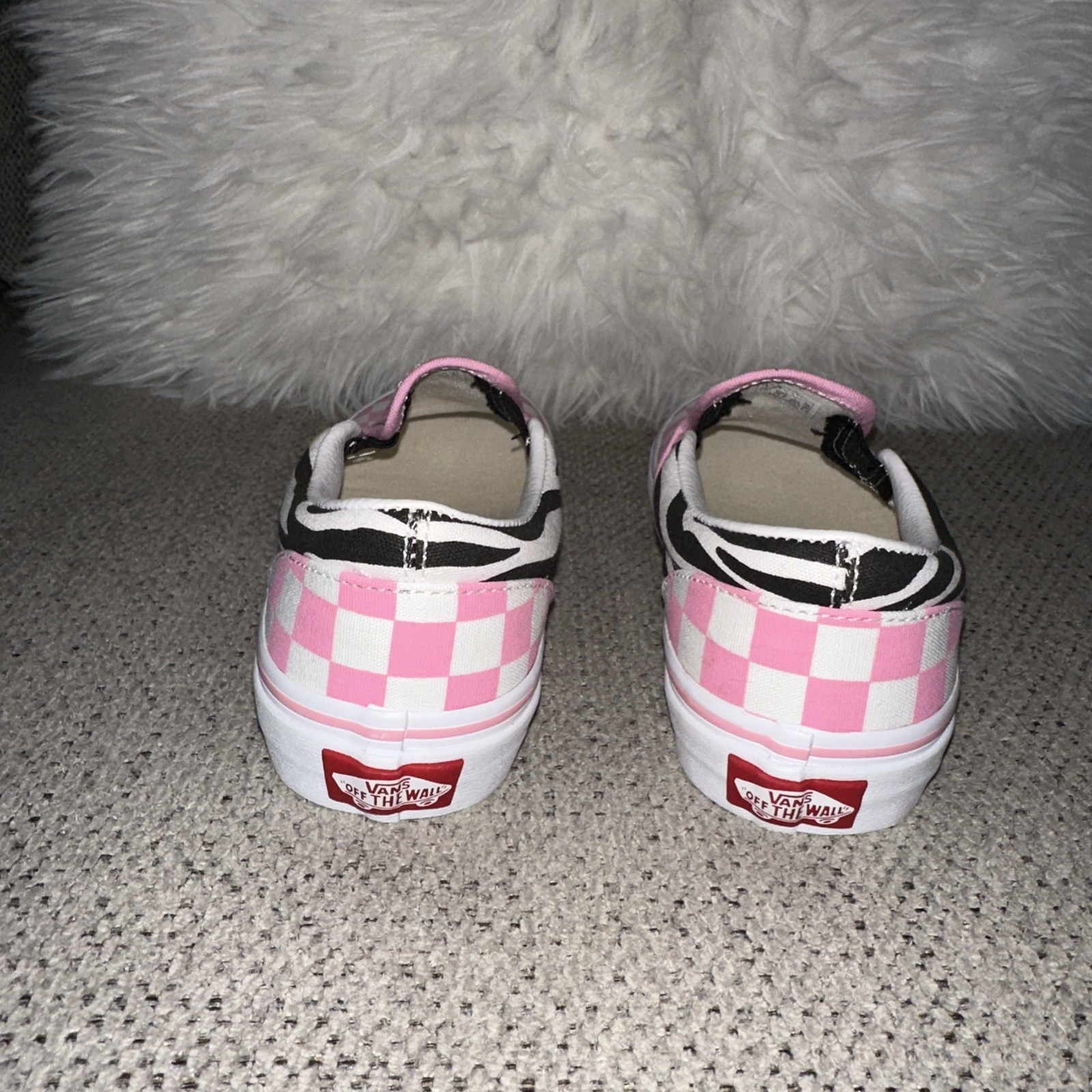 This is a pair of Vans girls' sneakers in a pink and white checkered pattern with black and white zebra accents. These slip-on shoes feature a low top design with a round toe and flat heel, making them comfortable for everyday wear. The rubber outsole provides traction, and the canvas upper material is durable. These stylish and versatile shoes are suitable for various occasions such as travel, activewear, and casual outings, making them a practical choice for young girls in size US 1.5.