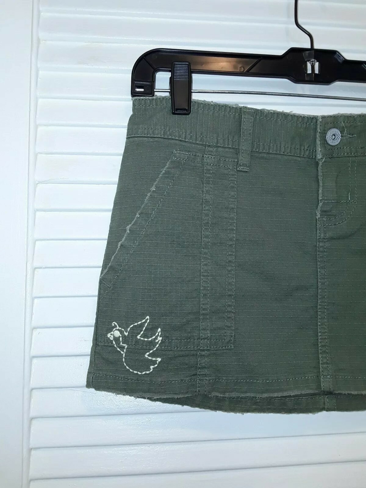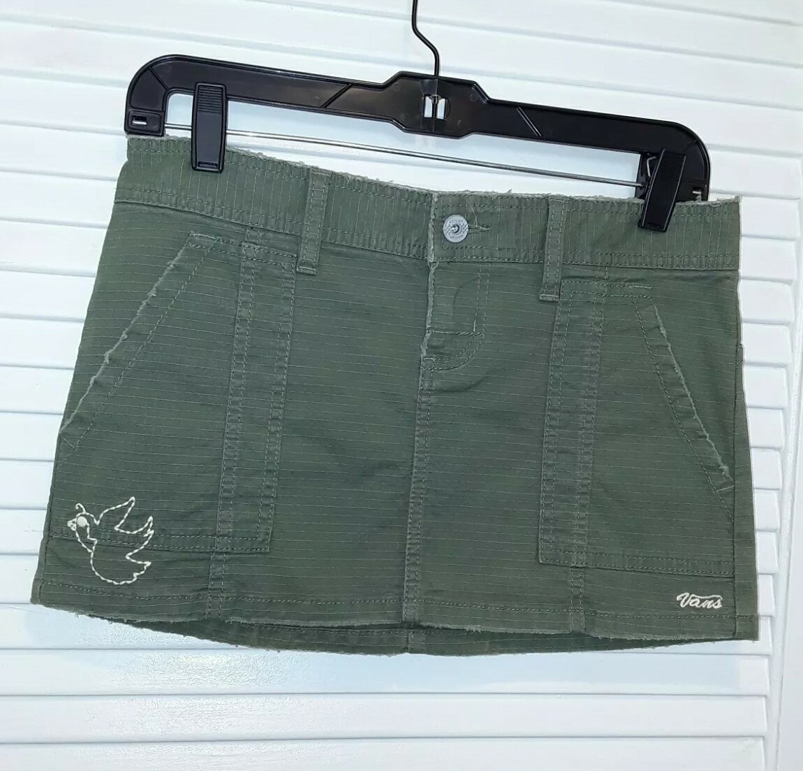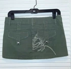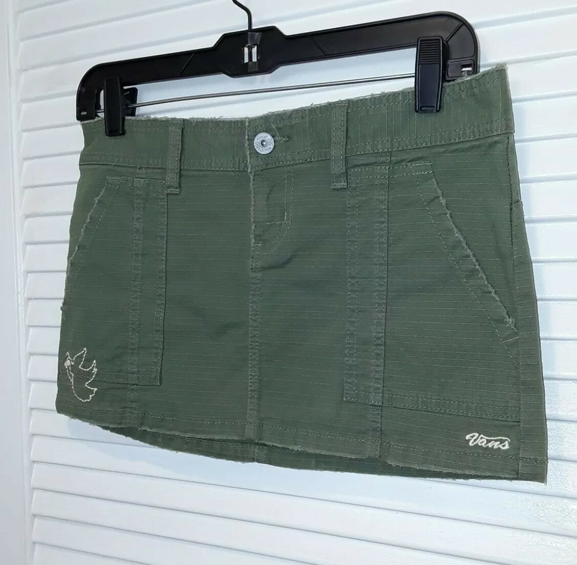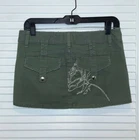 Vans Green Sage Embroidered Mini Skirt Size 1 Waist: 30" Length: 11" Zipper and Button Closure 2 Front Pockets, Belt Loops Bird Embroidered in Front with Vans Logo Back Embroidered with a flower and Cross As pictured.