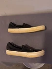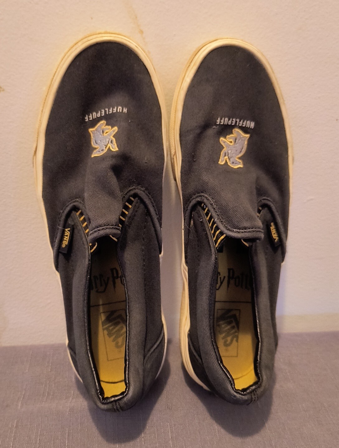 Step into the magical world of Harry Potter with these Vans x Harry Potter Hufflepuff Slip-ons. These slip-on shoes feature a round toe shape and a canvas upper material, making them perfect for casual wear, travel, and activewear. The shoes are lightweight, cushioned, and comfortable, making them ideal for everyday wear. The black color of the shoes is accented with an embroidered logo and a Hufflepuff pattern, adding a touch of Harry Potter magic to your outfit. These limited edition slip-on shoes are available in men's size 7.5 and women's size 9, and are part of the Vans x Harry Potter product line. Get ready to venture into the wizarding world with these stylish and comfortable slip-on shoes.