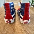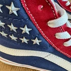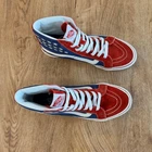 Vans | High Top American Flag Studded Stars | Women’s Size 7.5 or Men’s Size 6 Brand: Vans Shoe: High top sneaker Style: American Flag Studded Stars Size: Unisex Women’s 7.5 or Men’s 6 Color: Red, white, blue, silver Details: Silver studded stars Condition: Pre-loved in great condition. Minor signs of wear. (See listing photos) Thank you and have a lovely day!