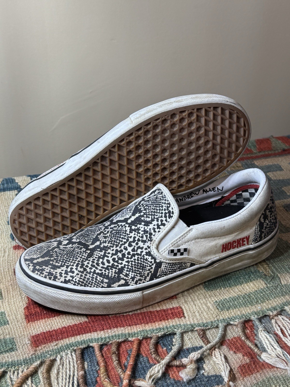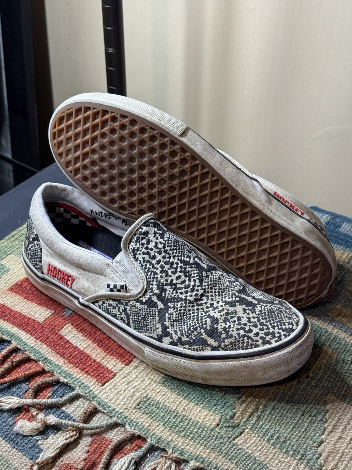 Vans x Hockey Andrew Allen Slip On Pro Size 10.5M Skate Shoes Snake Print. Insoles are basically brand new. Condition Pre Owned - See Photos. Q&A DM Me. FAST SHIPPING!
