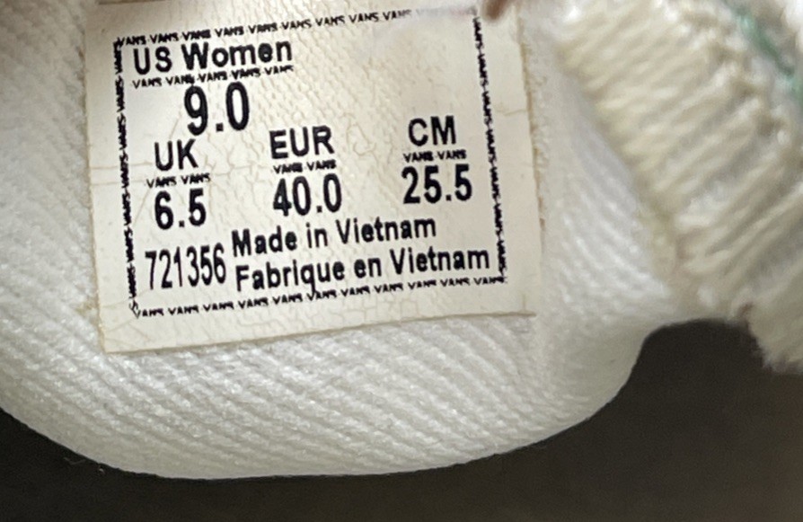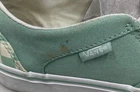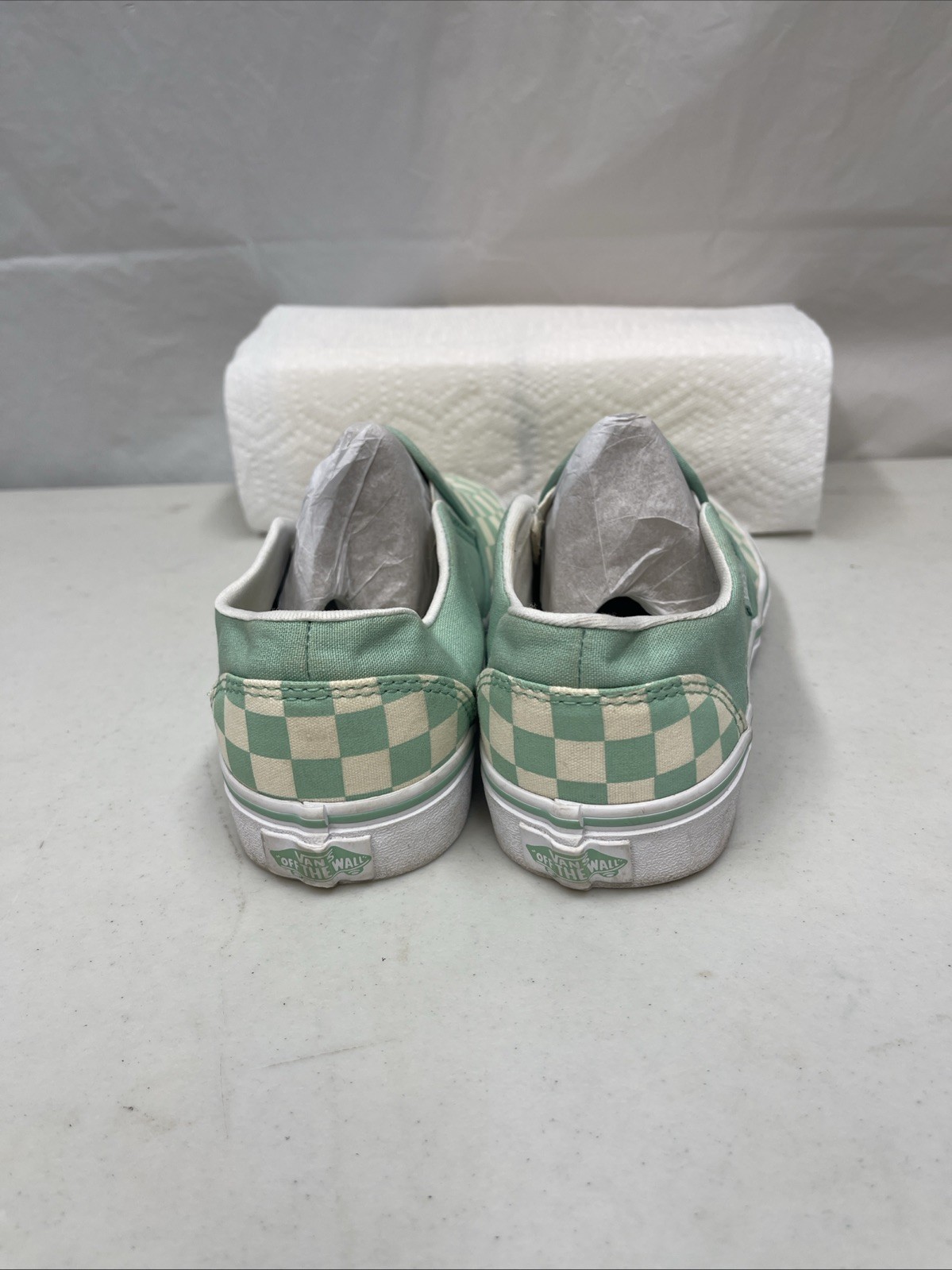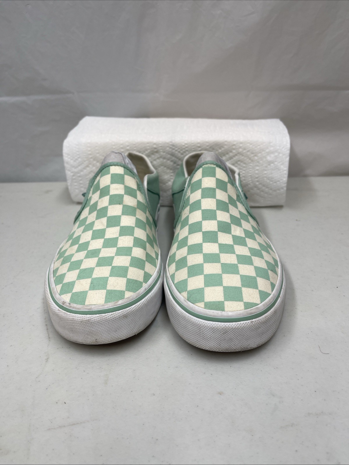 The product is a pair of Vans Low-top Skate Loafers in women's size 9, featuring a green checkered pattern with a small stain on one shoe. These shoes have a low-top design with a slip-on style, perfect for a casual and comfortable look. Made by Vans, a well-known brand in the athletic shoe industry, these loafers have a trendy and stylish design that is both practical and fashionable. Perfect for skating or everyday wear, these shoes are a great addition to any wardrobe.