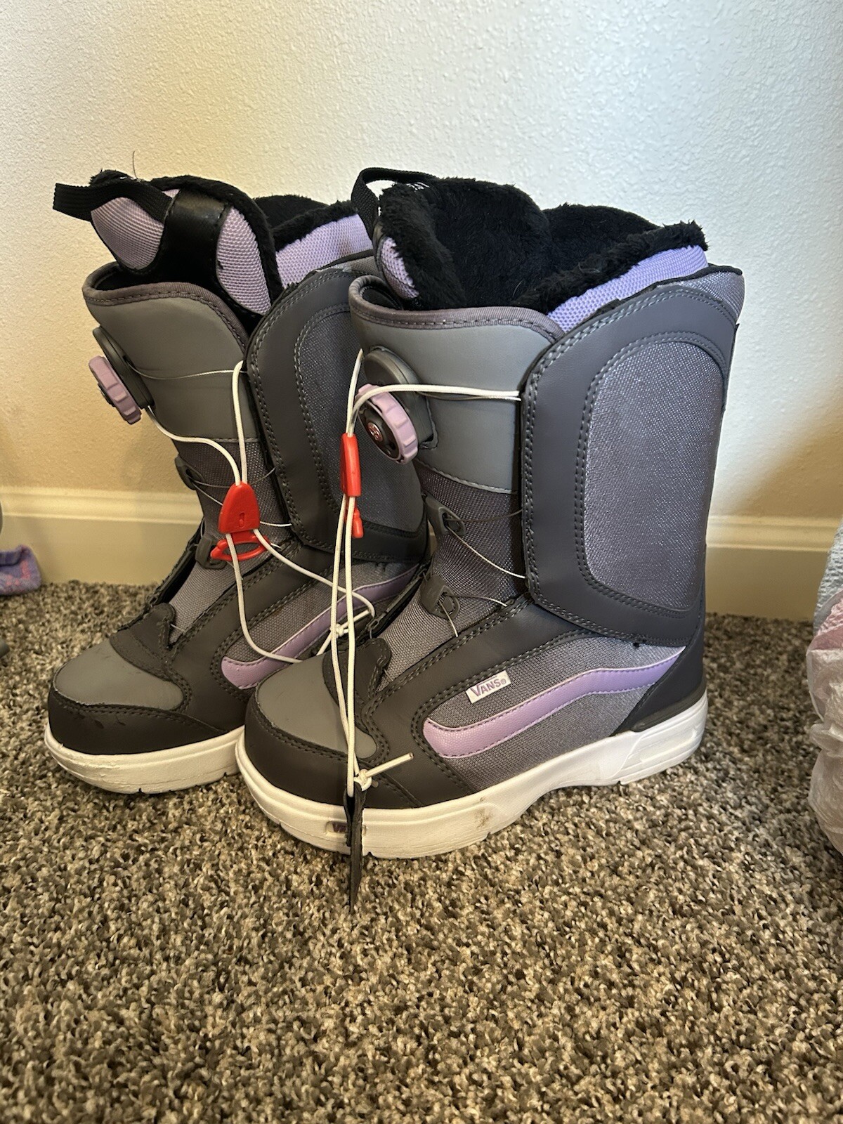 These are pre-owned Vans Mantra snowboard boots in gray and lavender, designed for women in size 7.5. They are suitable for snowboarding and feature a winter boot style. Only used once