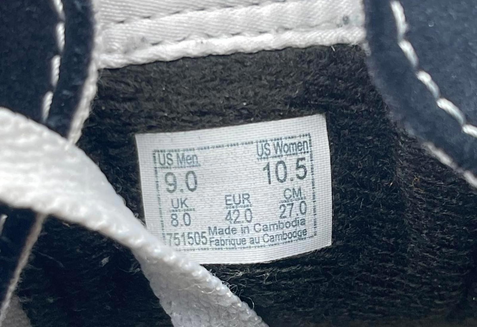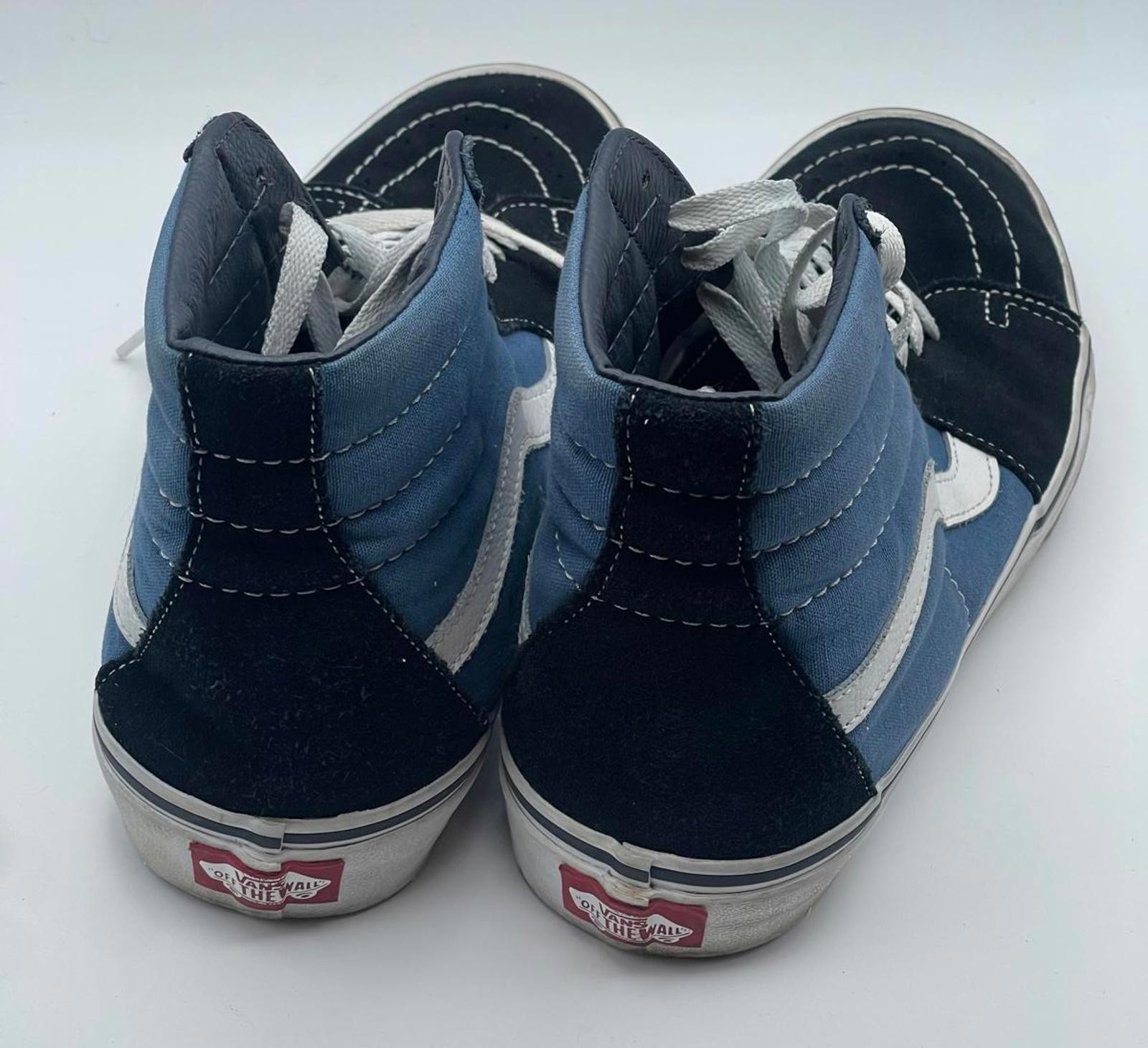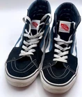 Classic Vans high-top sneakers in black and blue with white accents. Men's size 9 US (Women's 10.5 US). Durable canvas and suede upper with signature Vans side stripe. Rubber waffle outsole for grip and durability. Comfortable padded collar and tongue. Great for casual wear or skateboarding.