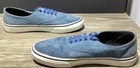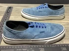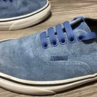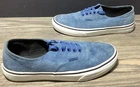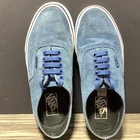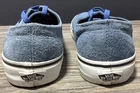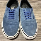 Step out in style with these pre-owned Vans Off The Wall blue suede shoes, perfect for both travel and casual occasions. With a closed toe and lace-up closure, they offer a comfortable fit and feature a Vans Off The Wall logo accent. These unisex shoes are a men's size 7 and women's size 8.5, with a rubber outsole and Scotchgard protection lining material. The solid pattern and autumn/winter/spring/summer season versatility make them an ideal addition to any wardrobe. Don't miss out on these Vans Off The Wall blue suede shoes.