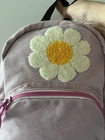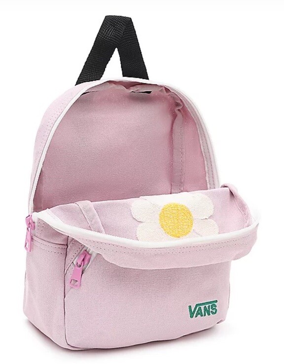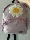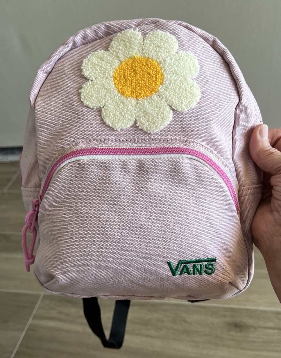 Vans Oversized Floral Mini Backpack has a main compartment and a front pocket both with contrast zips. It has adjustable shoulder straps and has a fluffy textured Daisy boucle appliqué and embroidered green Vans logo on the front. The bag measures 10” x 8”x 5 “ inches .Color of the canvas is a lavender pink and the zippers are hot pink . In great pre owned condition, no stains or tears . Very clean . Thanks for shopping !