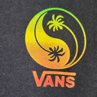Vans t-shirt featuring a unique yin-yang inspired palm tree gradient logo design in green, yellow, and orange colors on black cotton. The graphic shows 'Off The Wall' text in a circular design. Shirt is in good pre-owned condition with minimal wear. Color: Black Department: Men Type: T-Shirt Fit: Regular Sleeve Length: Short Sleeve Pattern: Graphic Print Features: Graphic Logo, Short Sleeve, Gradient Design, Brand Print, Casual Fit Neckline: Crew Neck Material: Cotton Keywords: vans, off the wall, palm tree, tropical, gradient, skate, surf, graphic tee, yin yang, streetwear, skateboarding, summer all items have been cleaned and disinfected we stand behind all we sell so please contact us if you have an issue with any order