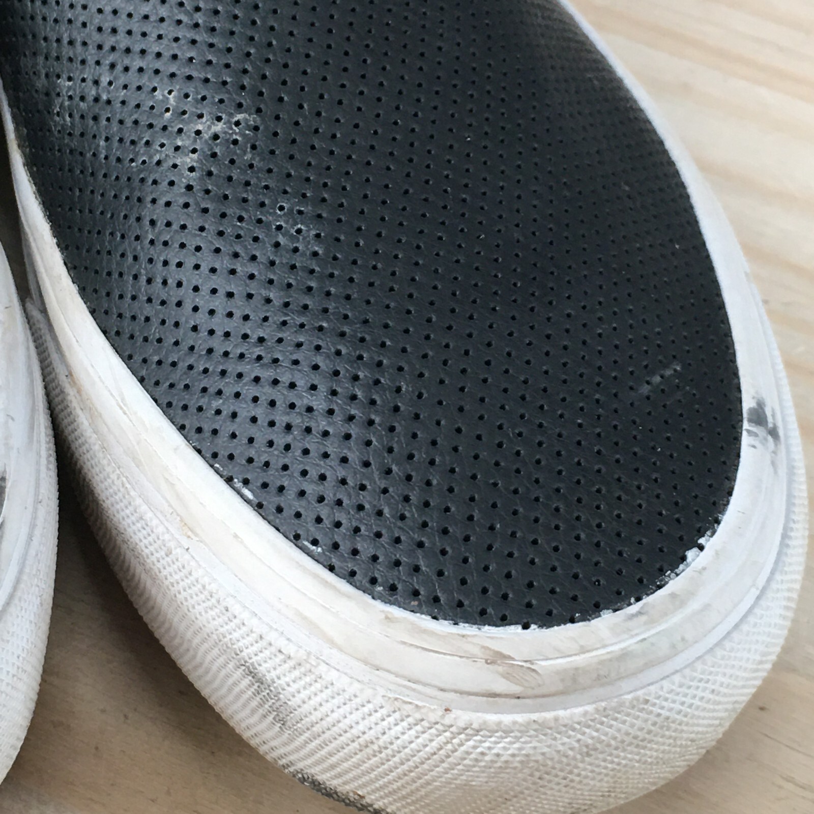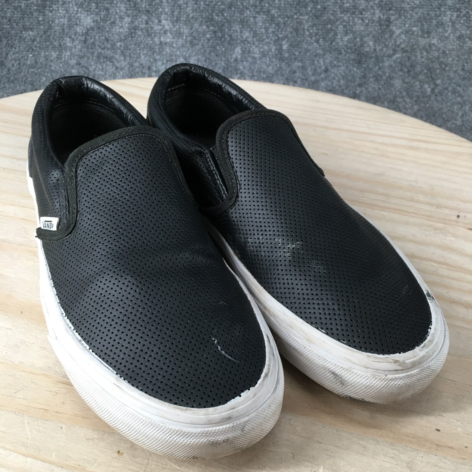 Vans Shoes Mens 7 Womens 8.5 Off The Wall Perforated Slip On Skate Loafer Black *Please read the entire description* Fair Condition: Tops have minimal wear, with insole wear, scuffing and creasing. Bottoms have sole wear and heel wear. See photos for the details. US Size: 7 UK Size: 6 AU Size: 6 Euro Size: 39 Item well cared for. We ship SAME DAY the item is ordered so expect a FAST delivery! Condition of shoes are best viewed by zooming in on pictures. Please look at all of them :) The photo with a ruler is lined up with the back of the heel and shows the approximate length of the shoe from the top view. Measure and compare your own shoes in the same fashion. We are sorry but we cannot answer any questions regarding further measurements. The tag on the shoes is just a SKU number for organization and is not a size or a price tag. Message me if you have any problems and we will make it right QUICKLY! We post 100s of items every week in my store. Check it out!