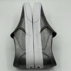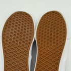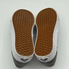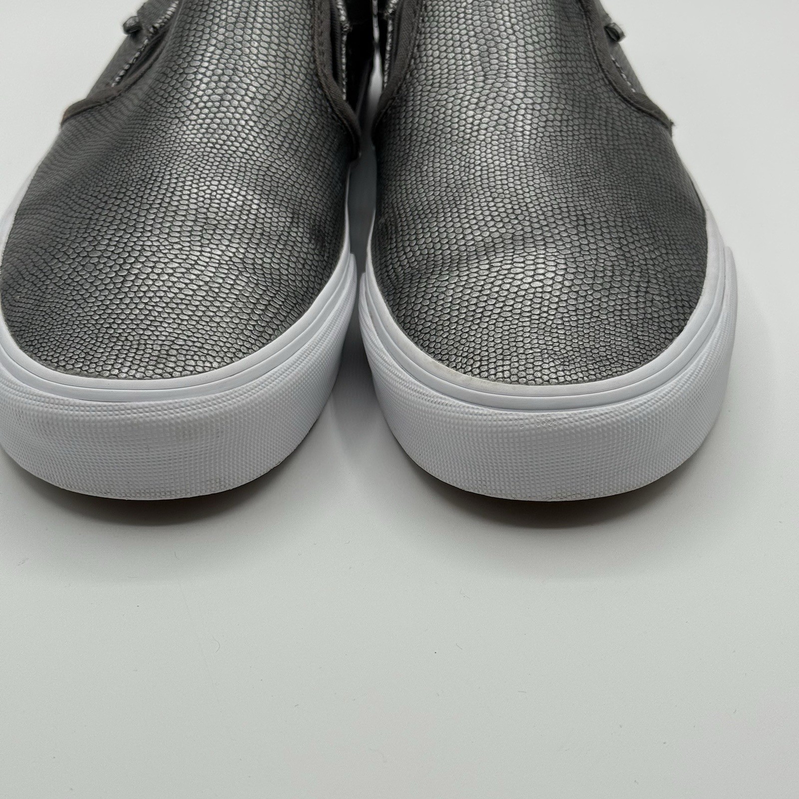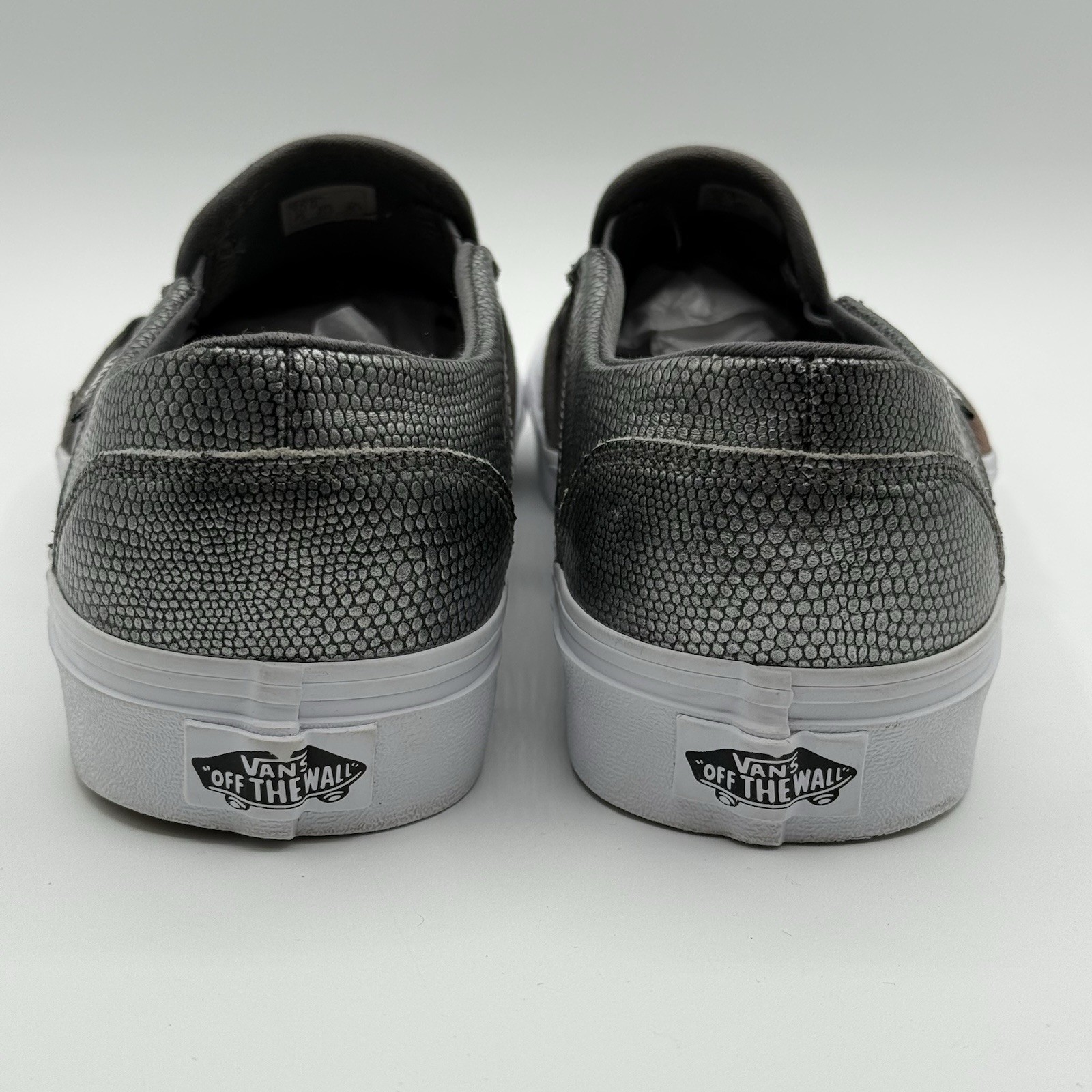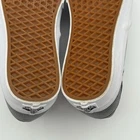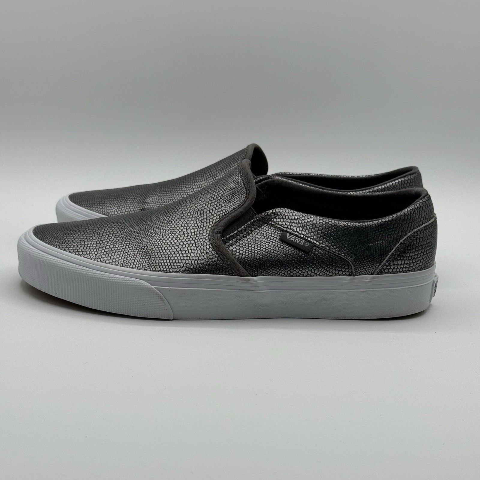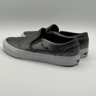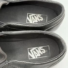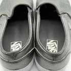 Experience timeless style with Vans' iconic black and white slip-on loafers. Featuring a minimalist design, these shoes boast a solid black canvas upper, a white rubber midsole with the signature waffle pattern, and elastic side panels for easy wear. Perfect for casual outings, they offer both comfort and a sleek, versatile look. Please note: a tiny discoloration outer right side shoe. Otherwise, in good condition
