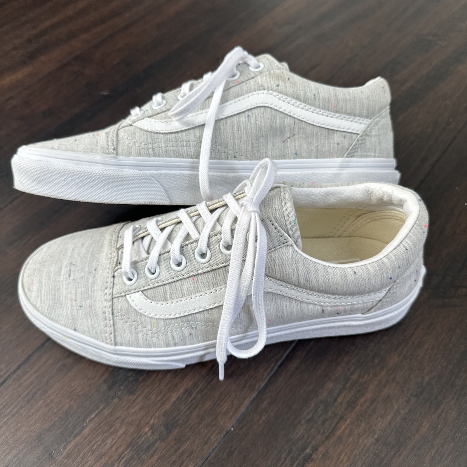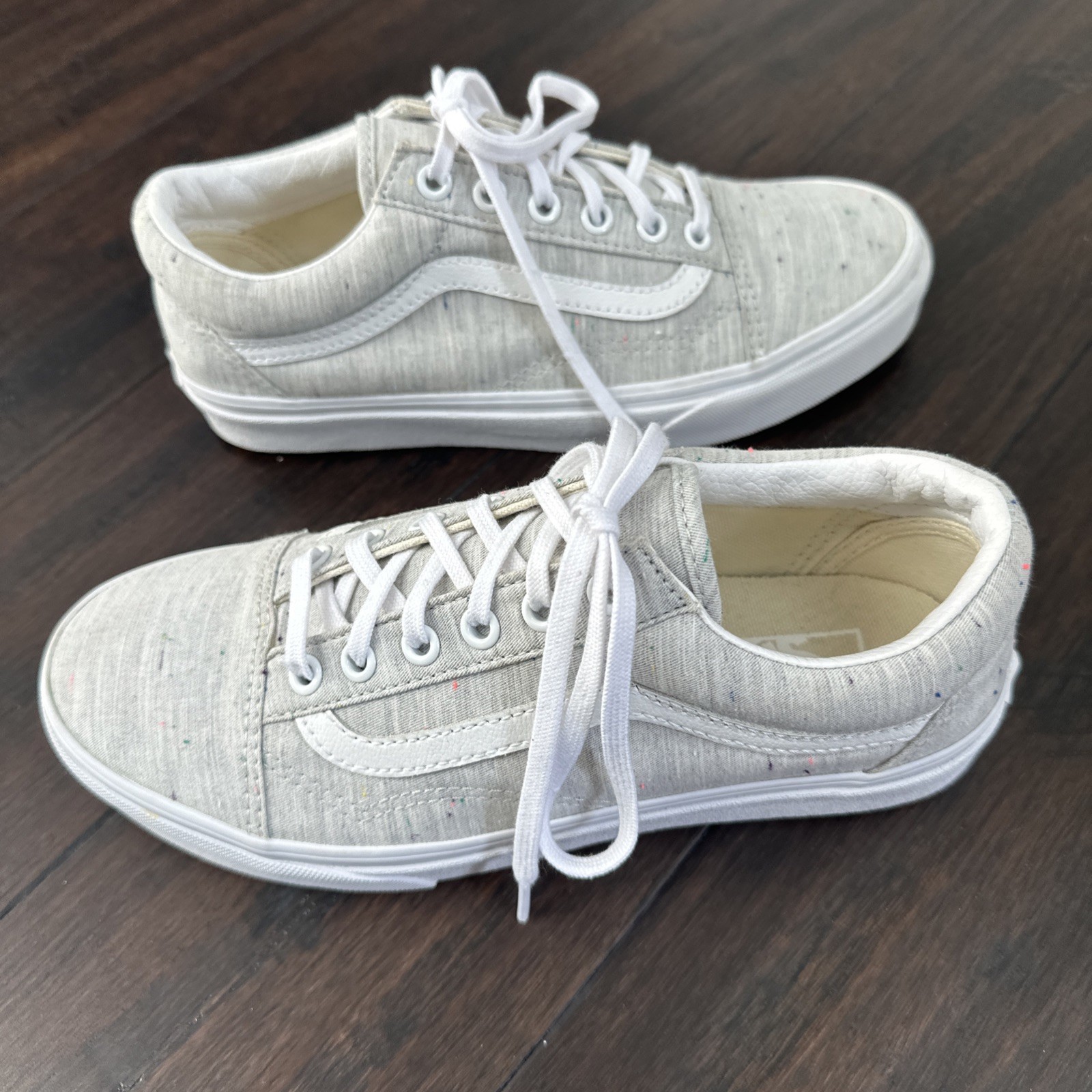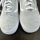The Vans Old Skool Jersey Grey & Speckled Skate Shoes are a unisex style featuring a classic gray and white design with a speckles of accent colorsThese athletic sneakers are part of the Vans Old Skool product line, with a release date of June 2, 2022. With a men's size 6 and women's size 7.5, these shoes offer a comfortable fit for skateboarders and everyday wear. The Vans brand is known for its quality and style, making these shoes a versatile and trendy choice for any wardrobe. Seriously, almost like new, only worn once.