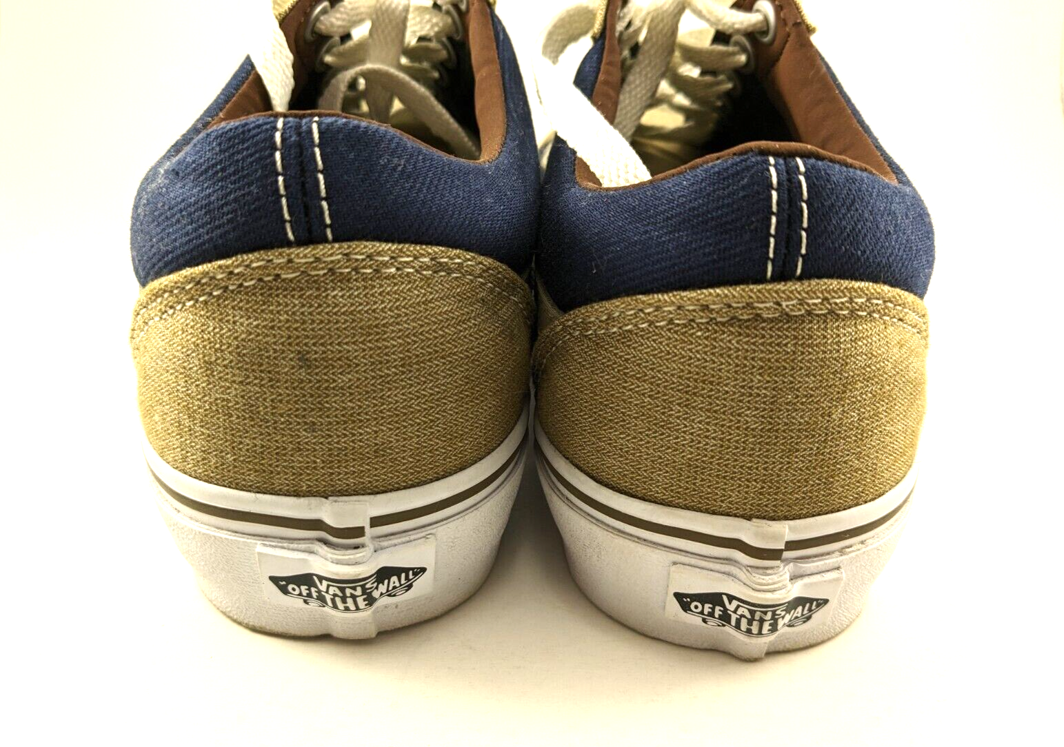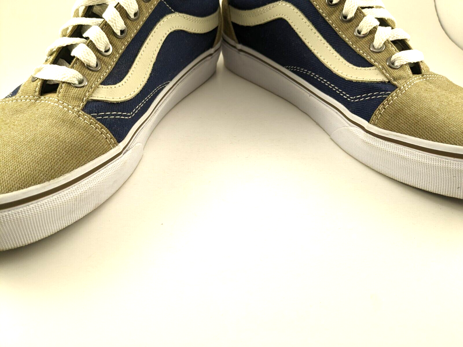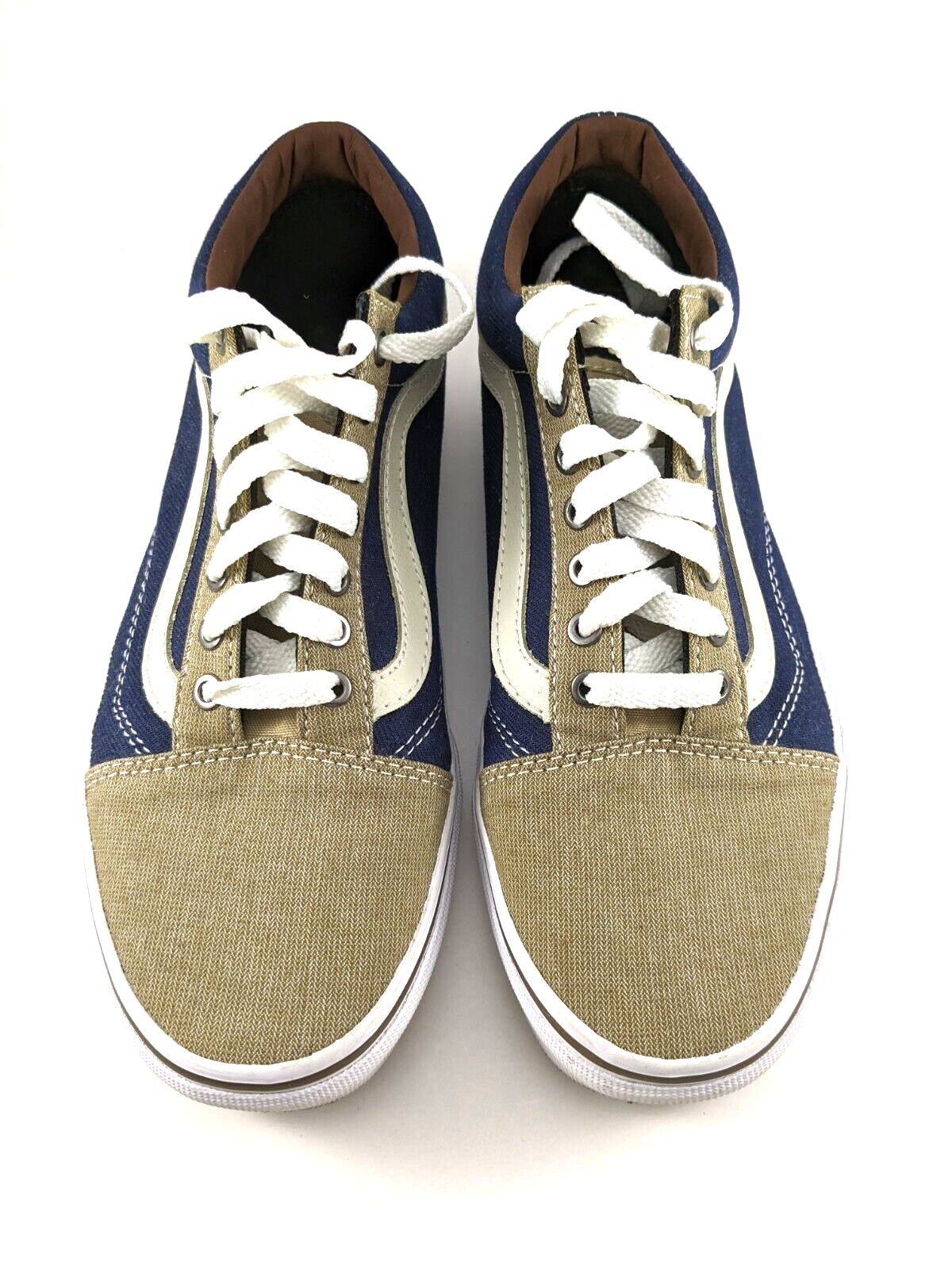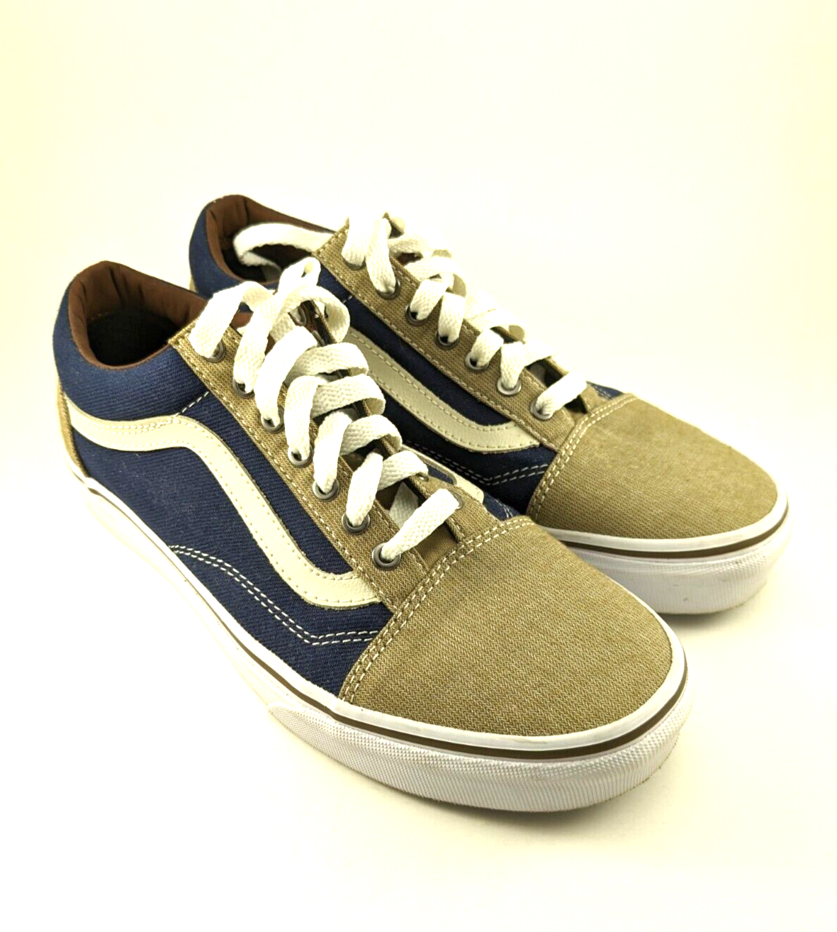 Step out in style with these VANS Old Skool sneakers! The blue and khaki color combination gives a unique look to these unisex trainers, perfect for both men and women. The iconic VANS logo on the side of the sneakers adds a touch of class to these shoes. These athletic sneakers are perfect for any occasion, whether it be a casual day out or a gym session. The size 7 men's/8.5 women's fit ensures a comfortable fit for a range of foot sizes. Shoes are in excellent, used condition. Only worn a few times. Super clean. From a non-smoking home.