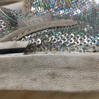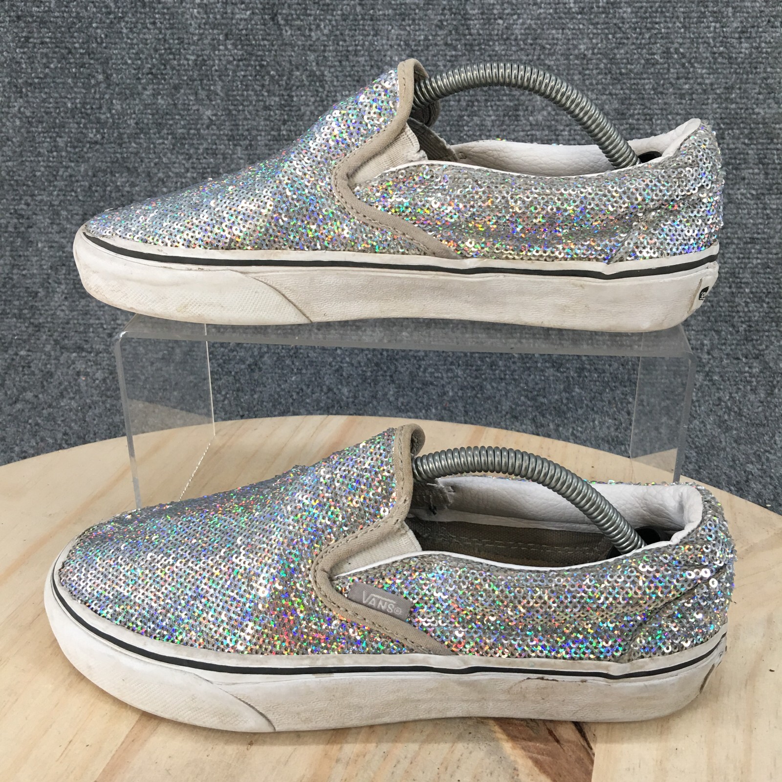 Vans Shoes Mens 5 Womens 6.5 Off The Wall Sequined Slip On Loafer 721454 Silver *Please read the entire description* Fair Condition: Tops are minimal wear, damage toes and sides, scuffing and staining, damage insole in right foot. Bottoms have heel wear and sole wear, minimal wear. US Size: 5 UK Size: 4 AU Size: 4 Euro Size: 36.5 Item well cared for. We ship SAME DAY the item is ordered so expect a FAST delivery! Condition of shoes are best viewed by zooming in on pictures. Please look at all of them :) The photo with a ruler is lined up with the back of the heel and shows the approximate length of the shoe from the top view. Measure and compare your own shoes in the same fashion. We are sorry but we cannot answer any questions regarding further measurements. The tag on the shoes is just a SKU number for organization and is not a size or a price tag. Message me if you have any problems and we will make it right QUICKLY! We post 100s of items every week in my store. Check it out!