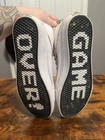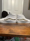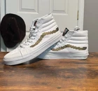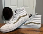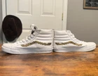 Elevate your skateboarding game with these Vans Sk8 Hi Slim Nintendo Women's shoes. The metallic accents and console gold/white colorway add a touch of gamer style to your activewear or casual outfit. The lace-up closure and high-top shoe shaft style ensure a comfortable and secure fit for slim-heeled skateboarding. Made with canvas upper material and manufactured in China, these Vans Sk8 Hi shoes are part of the Vans Otw product line and feature a Nintendo pattern and character. Perfect for winter, summer, fall, or spring, these sneakers are a must-have for any 90s Mario fan. Available in women's size 7.5 and men's size 6 console, these Vans Sk8 Hi shoes are a great addition to any skater's shoe collection. Worn a couple times A1