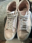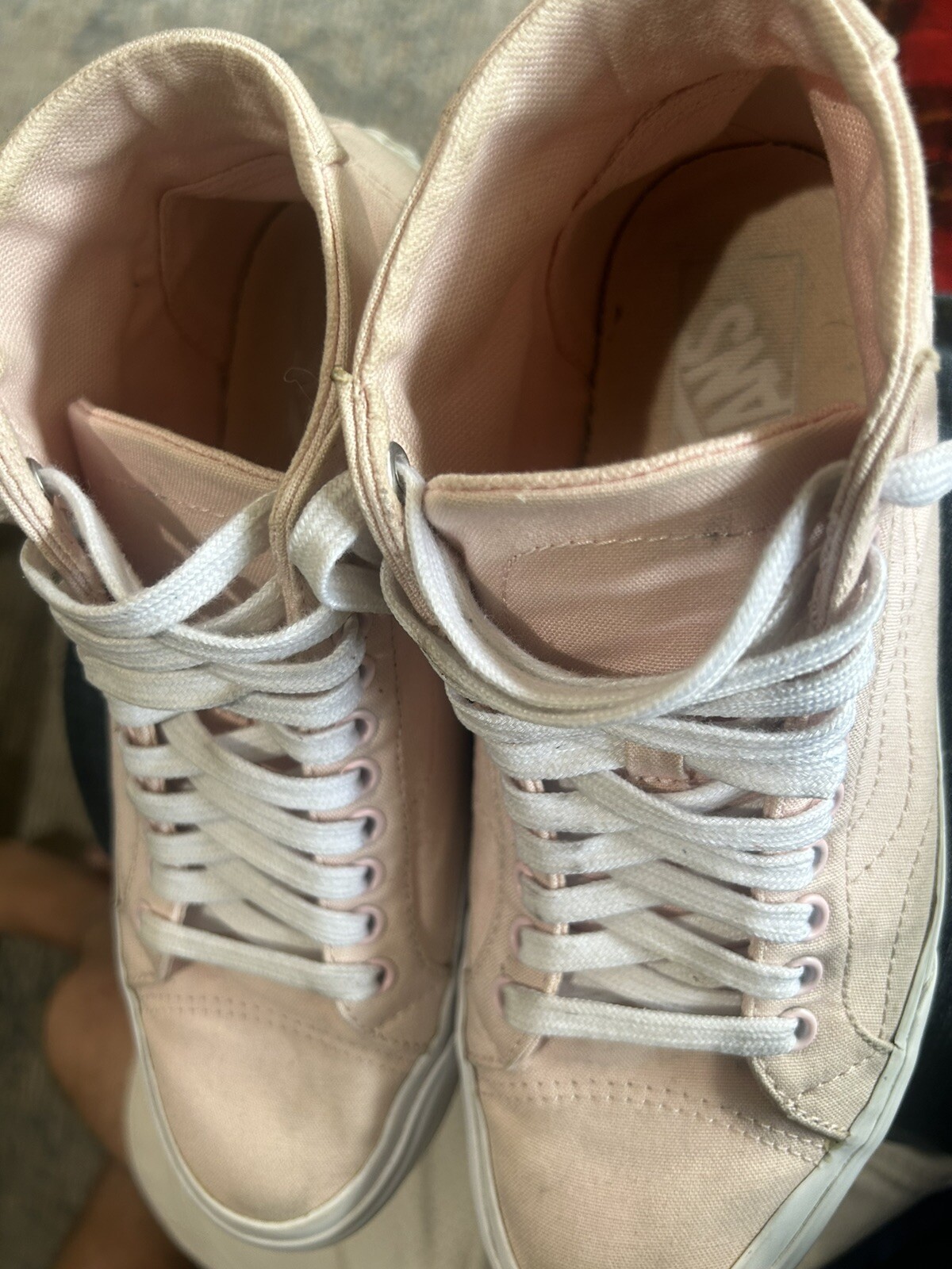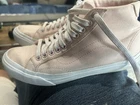 Vans Mens 7,Womens 8.5,Off The Wall, 721454, Skateboard Peach Canvas HighTop. Preowned and in good condition with limited usage on the outer soles, inner soles and canvas. The color looks like a combination of peach or a pink color. See pictures for details and ask questions if necessary. Shipped with USPS priority flat rate shipping.