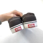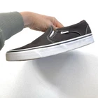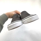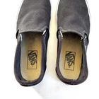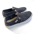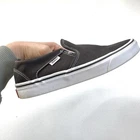 The Vans Slip On Loafer in size Women's 8 features a classic black canvas upper with a white sole. This casual shoe has a solid pattern, slip-on closure, and is designed for unisex adults. The shoe has a cotton upper material and comes US size 8 and EU size 38.5. It is a comfortable and stylish option for everyday wear. Smoke free home Pet free home Almost no wear on bottom of shoe Has some wear on inside (see pictures)