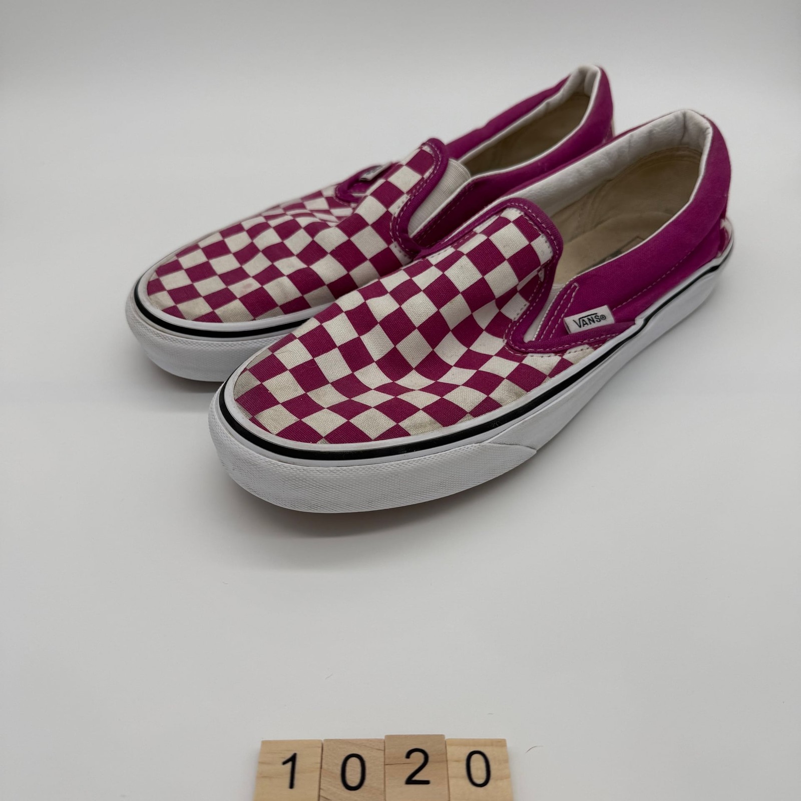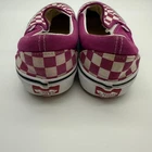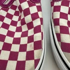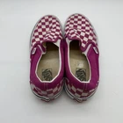 Vans Classic Slip-On Checkerboard shoes in Cerise/True White. These iconic slip-ons feature the signature checkerboard. They are a men's size 8.5 and women's size 10. In used condition, showing some signs of wear on the upper and soles, typical for pre-owned shoes. Any listed measurements are approximate. Preowned items have typical wear. We do our best to capture any flaws in photos. Thank you for shopping with us.