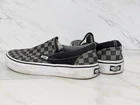 Classic Vans Slip-On Checkerboard Sneakers. Men's Size 8, Featuring a timeless black and gray checkered pattern, these shoes are perfect for any laid-back outfit. With a comfortable slip-on design, they're ideal for quick errands or a relaxed day out. Key features include: - Durable canvas upper for longevity - Cushioned insole for all-day comfort - Iconic checkerboard print for a stylish edge - Rubber sole for excellent traction Whether you're hitting the streets or chilling with friends, these Vans are a must-have addition to your wardrobe. Some dirt on edge of soles but no other indication of wear