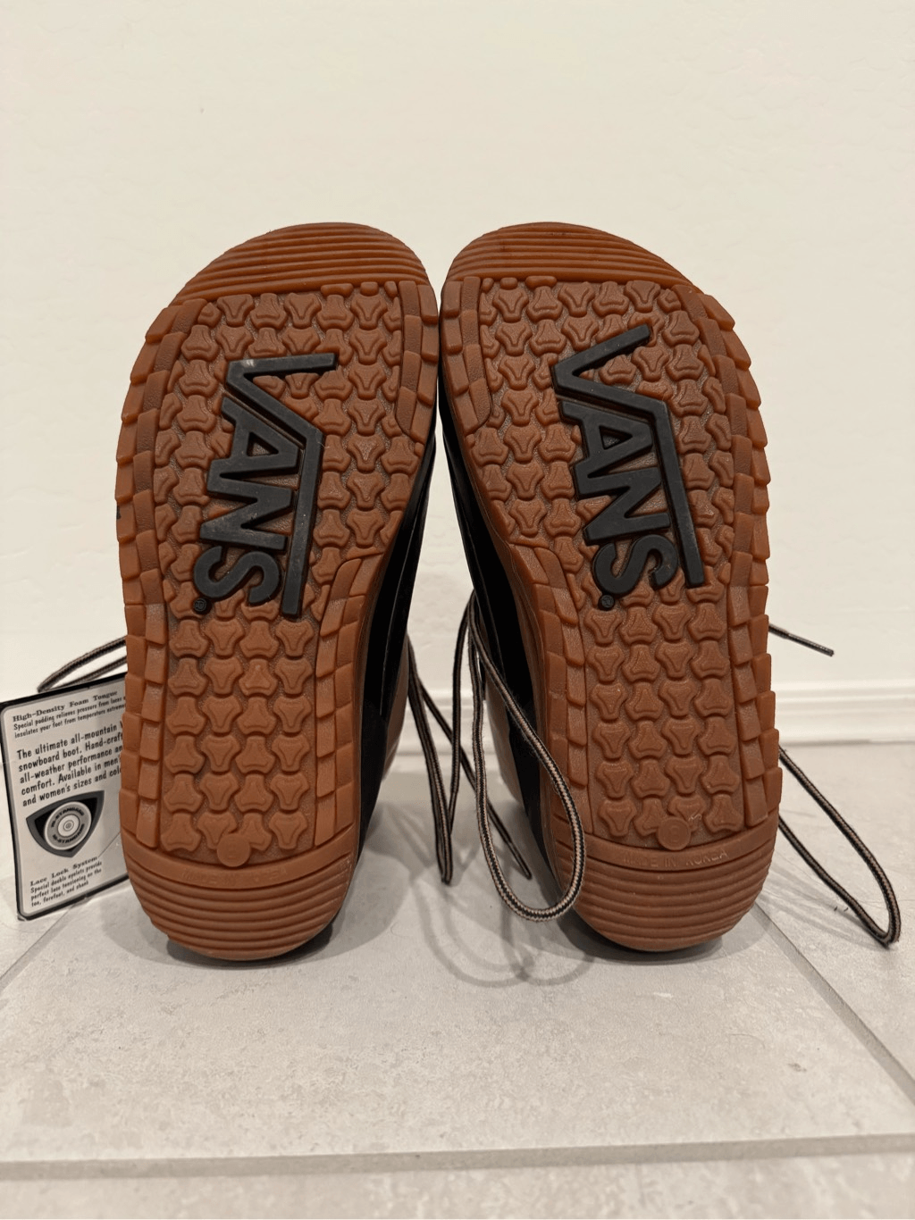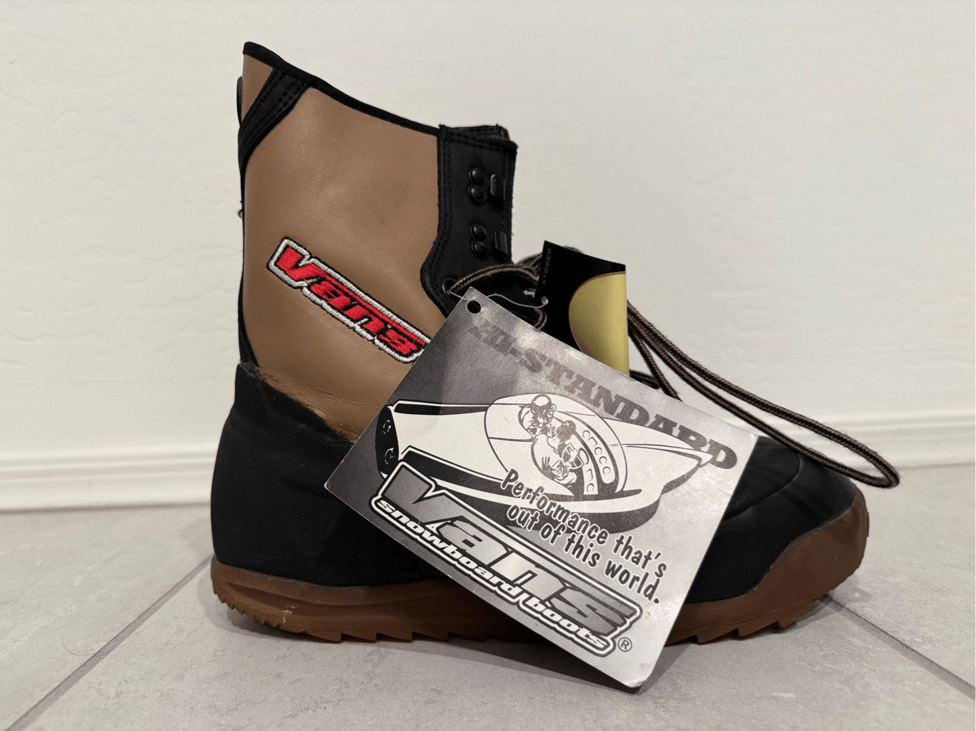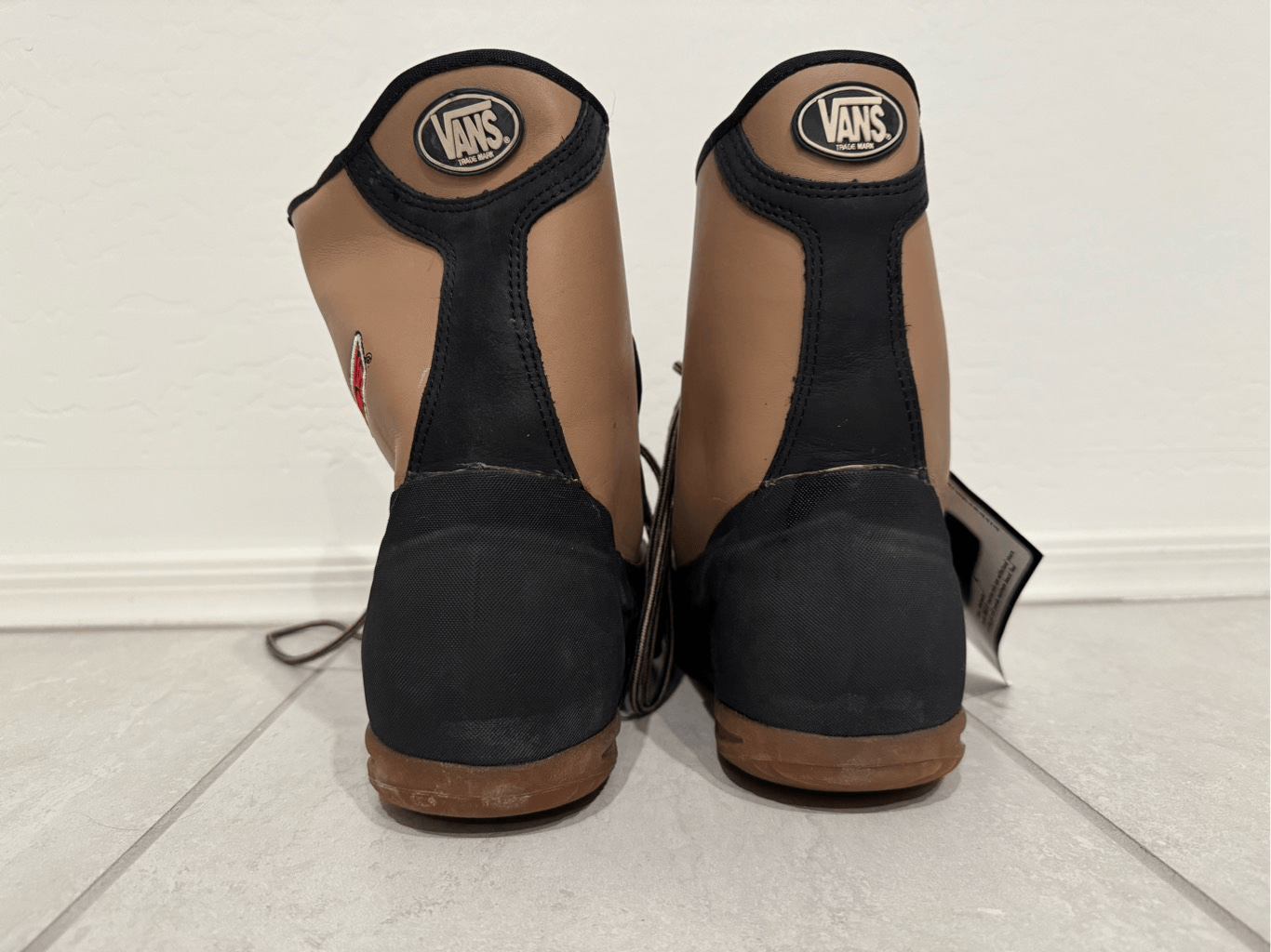 Vans Tan Black Colorblock Hi-Standard Vintage Retro Style Performance Snowboard Boots Size 8 NWT Brand: Vans Department: Mens Size: 8 Color: Tan, Black Type: Snow Boots Height: Ankle Toe Shape: Round Closure: Lace-up Pattern: Color-block Material: Synthetic Condition: New With Tags, (NOTE: showing slight signs of age around the seams, Missing the soles) Features: • Medium flex for balanced support • Adjustable • Reinforced high-wear areas for long-lasting use • Reverse Waffle outsole for superior grip on icy and snowy terrain • Retro-inspired design with classic Vans styling