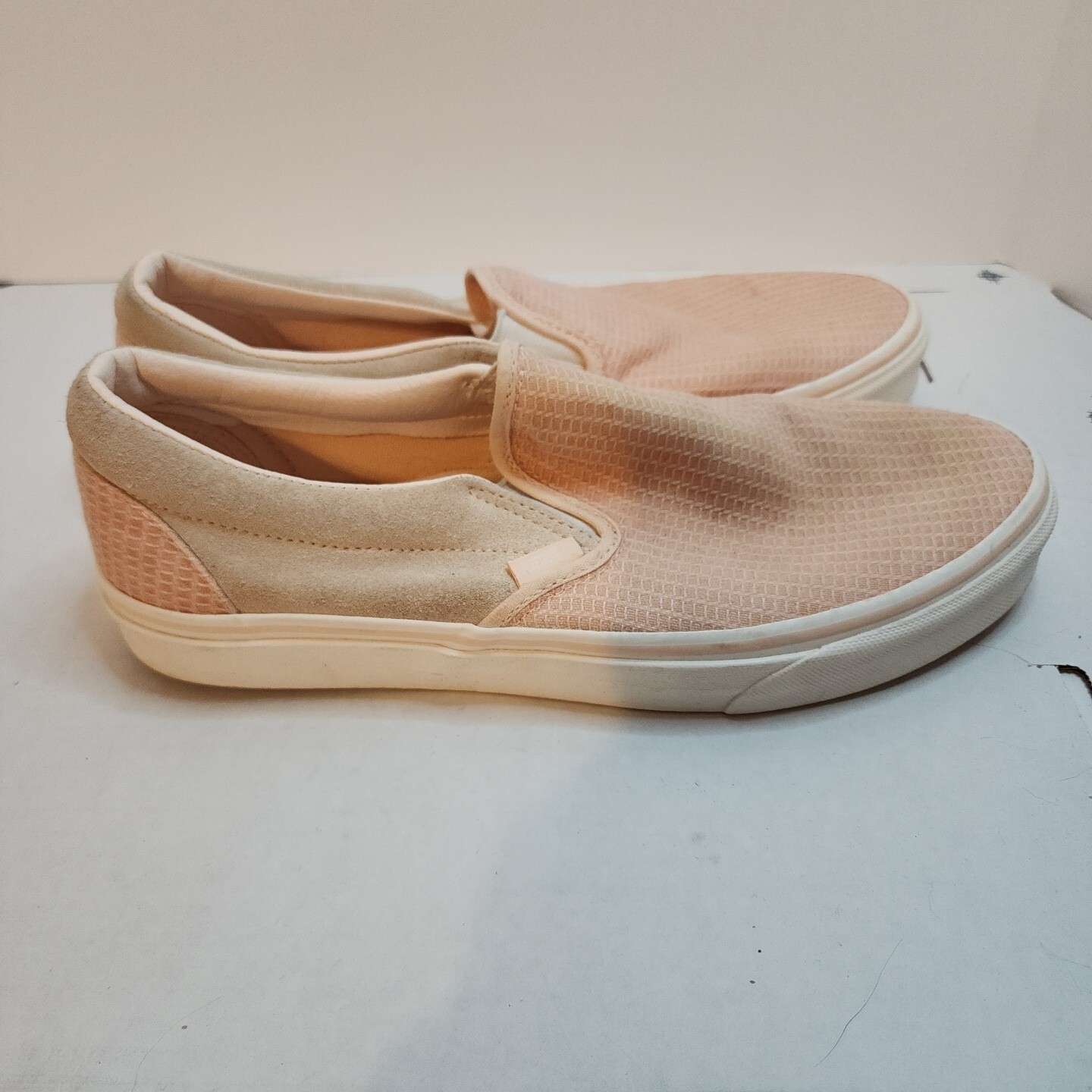 Vans Womens Classic Slip-On Multi Woven Shoes Creme De Peche Size 9.5. Very nice lightly used condition Pinky orange color with beige accents