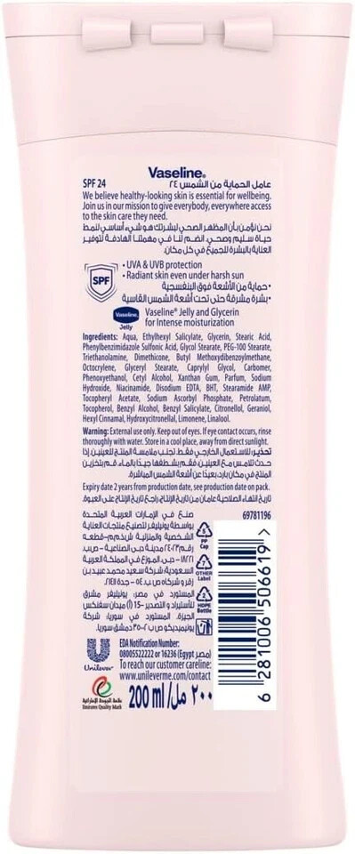 Vaseline Essential Even Tone Body Lotion 200ml free shipping world wide Product Overview Brand : Vaseline Product Name : Essential Even Tone Body Lotion Volume : 200ml Key Ingredients : Gluta-Hya Serum Burst : Combines the benefits of Glutathione and Hyaluronic Acid for enhanced skin radiance. Vitamin B3 (Niacinamide) : Known for its brightening properties, helping to even out skin tone. SPF 8 : Provides mild sun protection against UV rays. Petroleum Jelly : Locks in moisture, keeping the skin hydrated throughout the day. Benefits : Targets dark spots and uneven skin tone. Provides 24-hour moisturization. Leaves skin feeling soft and smooth. Offers mild sun protection with SPF 8 About this item Vaseline Essential Even Tone SPF 24 body lotion helps to restore and protect your skin against sun damage. Deeply moisturising lotion for glowing skin. Vitamins in this body lotion can help to reduce marks and boost skin radiance. Contains droplets of Vaseline jelly for moisturising skin care from within. A non-sticky, fast-absorbing, soothing lotion for body and hands. Daily body lotion suitable for all skin types to help provide glowing skin. Shipping All item will be shipped directly from MALAYSIA. ü Registered Post Item delivered will required signatures at the time of receiving. ü Dispatched items tracking number will be updated within 24 hrs. Of the dispatch. ü All items ordered will be dispatched within 48 hour after receiving the clear payment. ü All items require 15 to 30 business days to arrive at the given address. ü Please do not order if you are not willing to wait for above given time. ü All our items will be shipped worldwide, In any case the item is been stuck to the buyers custom department the buyer has to pay the custom charges for the receiving of the item. ü If you need express delivery we can arrange by DHL, Aramex, Fedex & UPS delivery time period 3-5 working days for more details please contact us through eBay message. . *condition apply*
