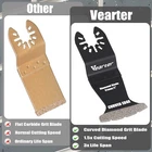 Vearter Dianomd Curved Edge Oscillating Blade NOTE: Not recommended for star lock interface system. 1.High-temperature quenching of diamond enhances wear resistance. This premium diamond oscillating saw blade has 3 times longer life than carbide grit blades in tough applications. 2.Diamond grit edge has a kerf approx. 0.08 inch (2.0 mm), which can achieve a perfectly clean and precise cutting effect. Segment swing grit grout blade is particularly suitable for precise cutting and short cutting as well as precise working right into corners and on edges. 3.The oscillating diamond blade with a flat side swing design can easily access into tight space like corners. So it is easy to replace the new tile. 4.This diamond oscillating multi tool blade is used to remove defective tile grout, clean up the mortar, plaster, and porous concrete to clean and rework planked deck joints. 5.Vearter diamond oscillating saw blades can be used for bathroom renovation, flooring work, trimming and correcting work, remove grits or grouts, clean up the mortar before fixing, and various household maintenance around the house.