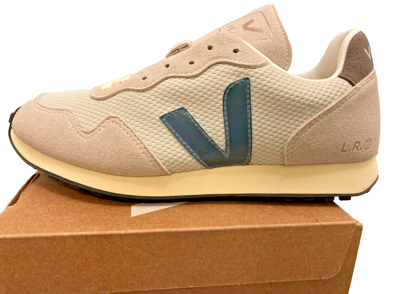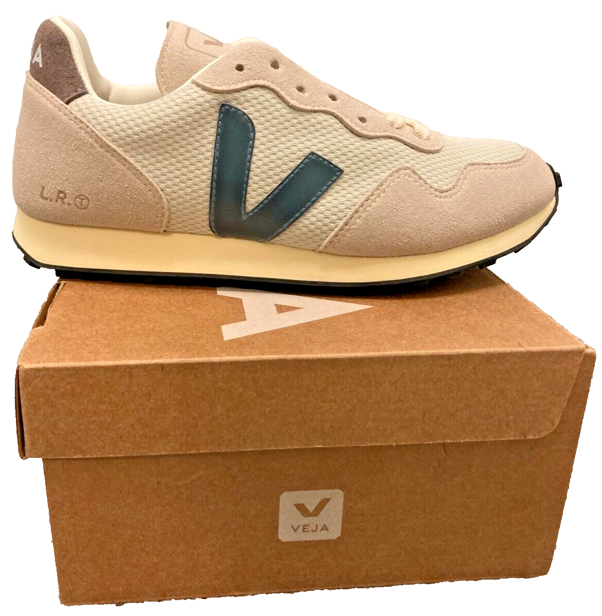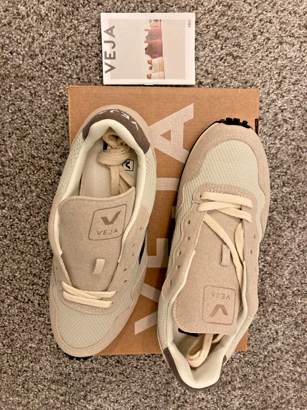 Yes, this is the Veja Suede Rec Alveomesh Sneaker: Natural California, new in box, original marking collateral (as pictured)! This beautiful color has been discontinued, but can be yours today. Never been worn. Upper: Alveomesh (100% recycled polyester) Panels: Vegan suede Logo V: T.P.U. Insole: Amazonian rubber (10%), Bio-based E.V.A. Ethylene Vinyl Acetate (41% sugar cane), recycled E.V.A. (10%), organic cotton (16%), and others (13%) Midsole: Bio-based E.V.A. (52% sugar cane) and others (35%) Outsole :Amazonian rubber (12%), silica (30%), synthetic rubber (49%), and others (9%) Lining: Tech (100% recycled polyester) Laces: Organic cotton (100%) Made in Brazil Alveomesh is a technical fabric made exclusively from recycled plastic bottles. It brings breathability, flexibility and lightness to the shoe. GTIN 0400585354657 SKU 1331378-097 If you would like a different shipping time / service, please contact me and I will do my best to accommodate your request (i.e. overnight or international). Buyer will pay shipping cost.