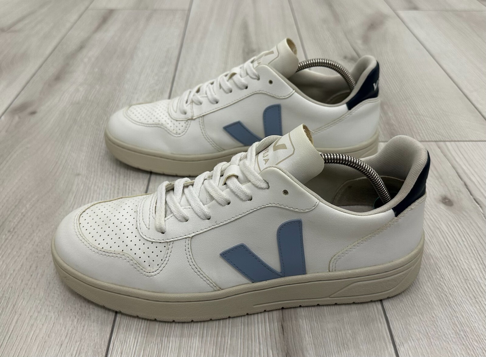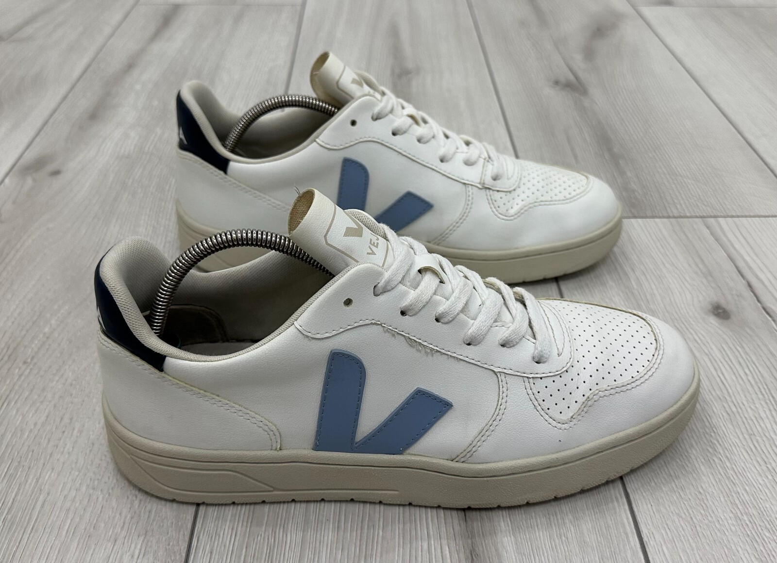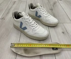 The Veja V-10 Leather Sneakers in White/Blue, Men's Size 8 are a stylish and versatile option for casual wear. Made with leather uppers and featuring a lace-up closure, these sneakers offer both durability and a comfortable fit. The white color with blue accents and logo detailing add a pop of color to any outfit. Designed by the brand VEJA and manufactured in Portugal, these sneakers are perfect for summer, fall, and spring seasons. The rubber outsole and foam insole provide added comfort and support for all-day wear.