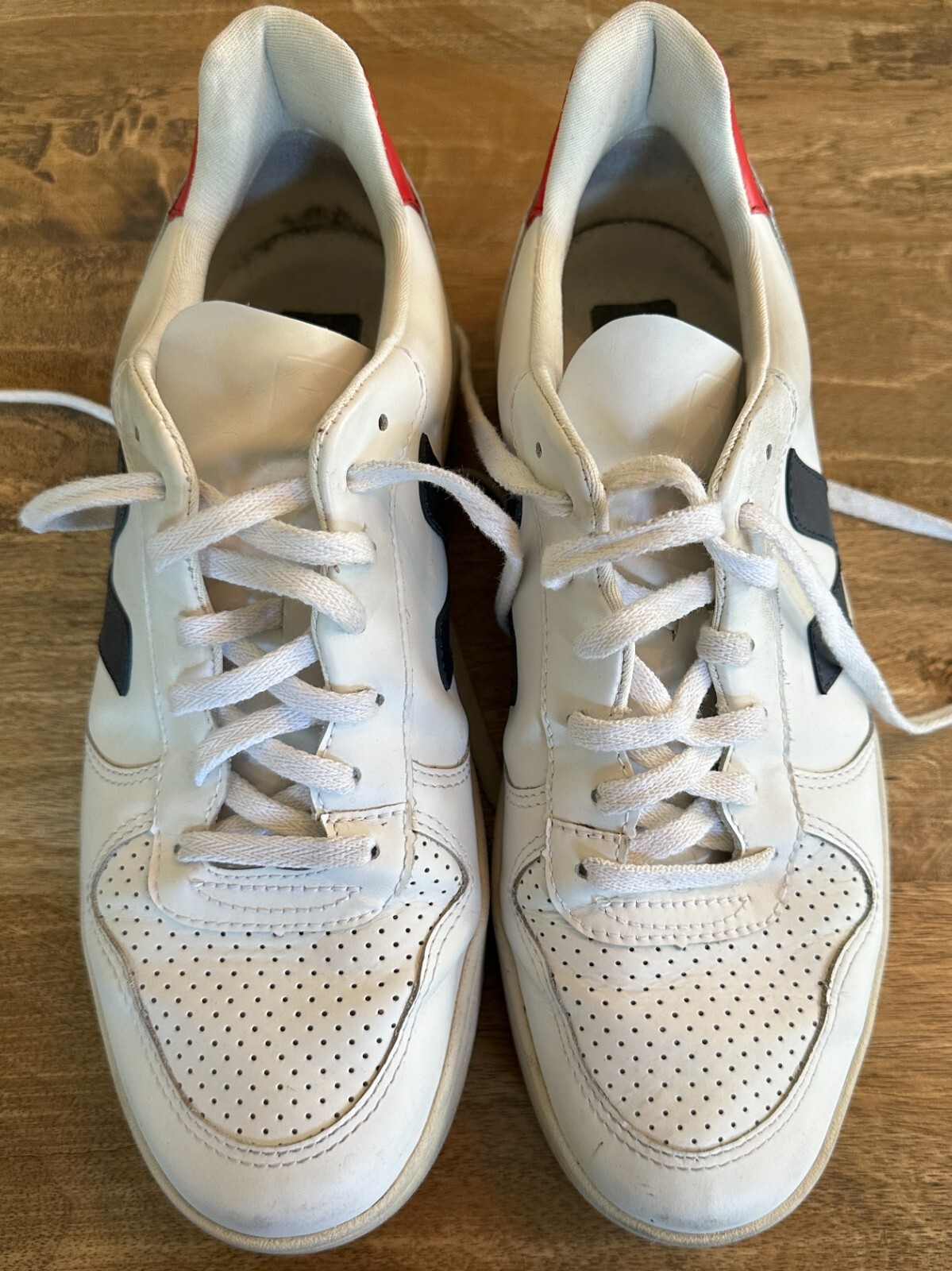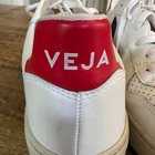 Veja Men's Leather Sneakers White Red Blue Size 11 US Casual Low Top These Veja men's leather sneakers are a stylish and sustainable choice, featuring a classic white upper with red and blue accents. Size 11 US. Hardly worn and in excellent condition, with only a few minor scuffs—practically like new. A great find for anyone looking for a clean, comfortable sneaker.